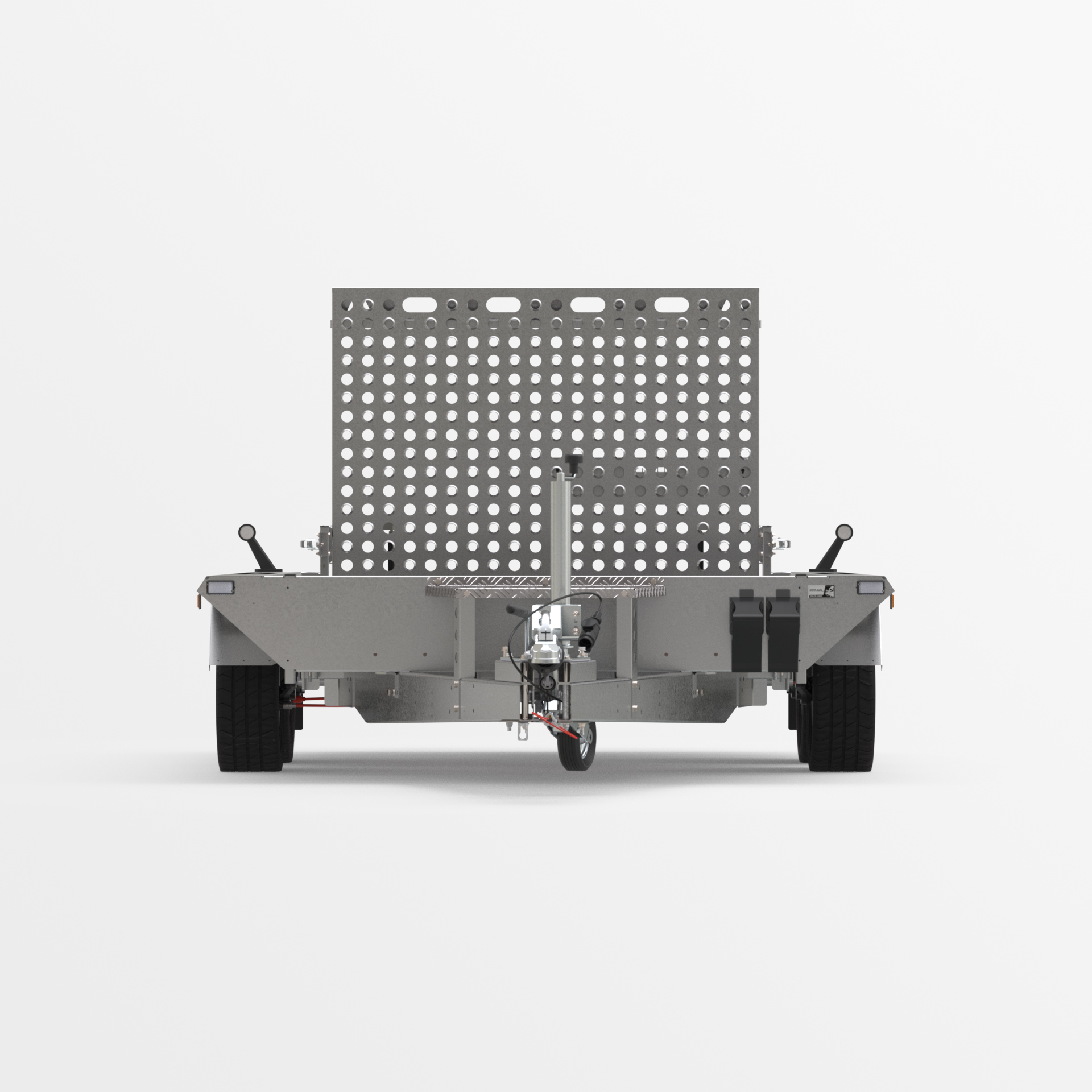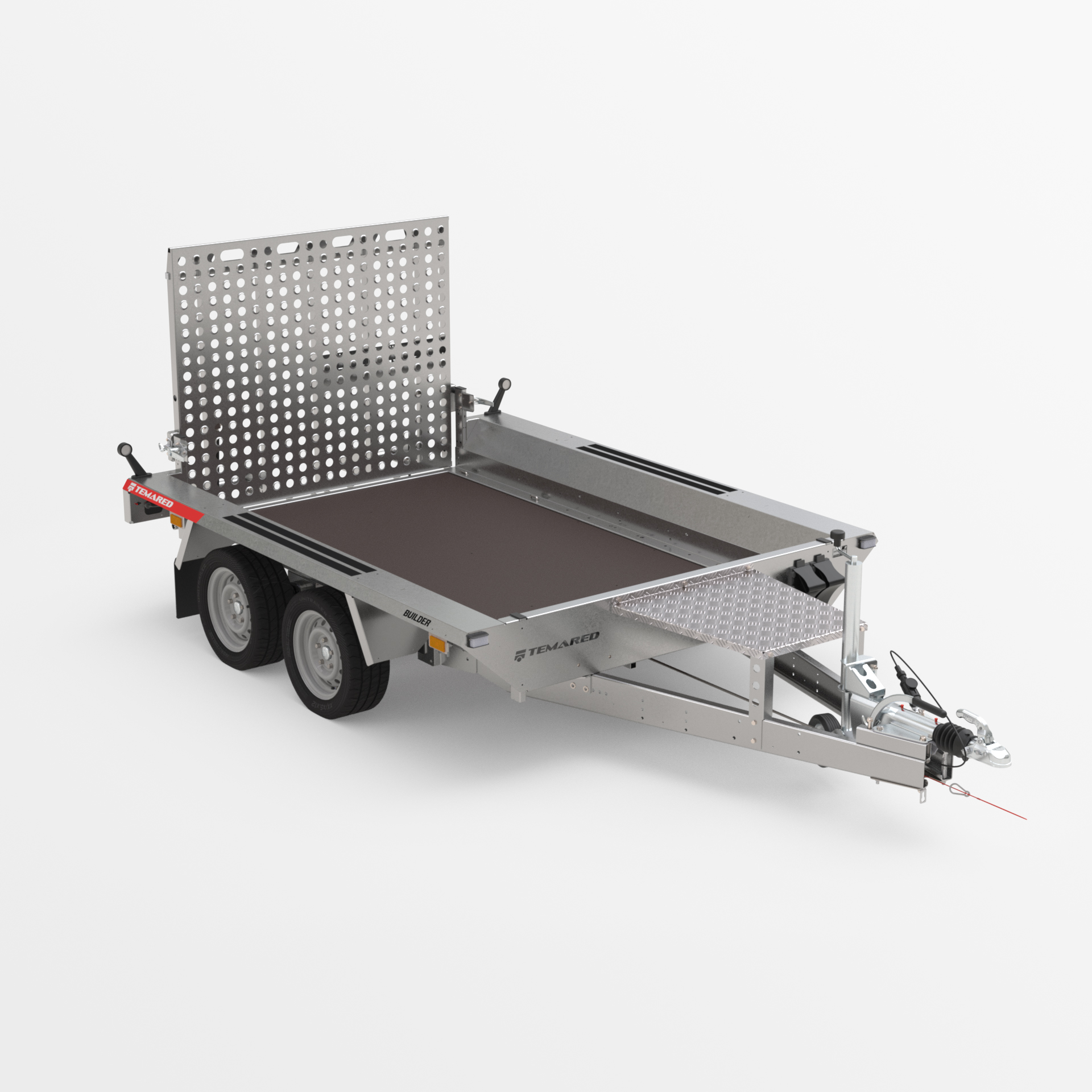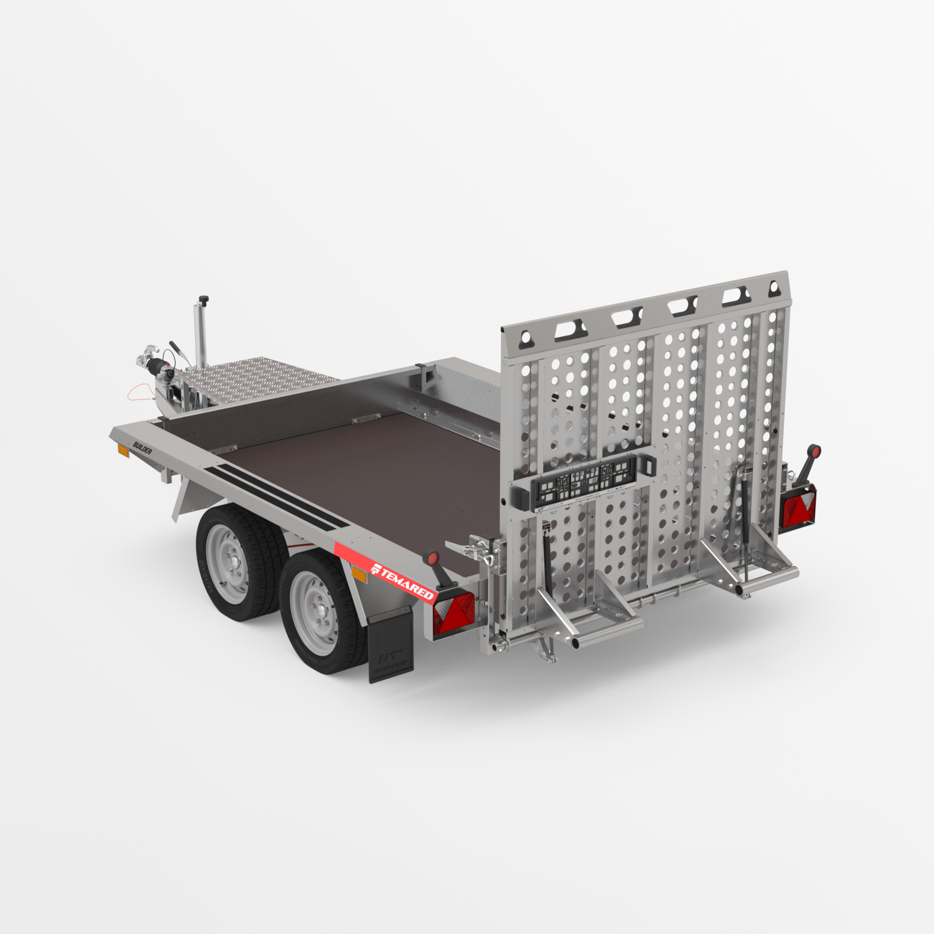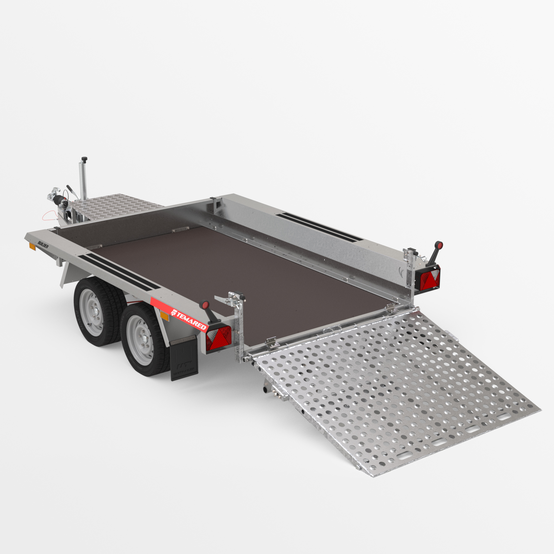 Robuster geschweißter Anhänger für den Transport von Baumaschinen und sehr schweren Materialien. Das originelle Design bietet die Möglichkeit, auf der gesamten Länge der mit Anti-Rutsch-Streifen ausgestatteten Seiten zu gehen. Geschweißter, tragender Rahmen aus geschlossenen Stahlprofilen. Rutschfester, wasserfester Sperrholzboden mit soliden Bodenklammern zur Ladungssicherung, um die Sicherheit der transportierten Güter zu gewährleisten. Äußerst robuste V-Deichsel und stabilisierende Auflaufstützen. Sitzbankstütze und Stützrad mit automatischer Klappung serienmäßig. Federn, die das Absenken und Anheben der Rampe erleichtern. Es besteht die Möglichkeit, die breite Unterfahrrampe durch zwei Unterfahrrampen zu ersetzen, wodurch das Gewicht des Anhängers verringert und die Nutzlast erhöht wird.