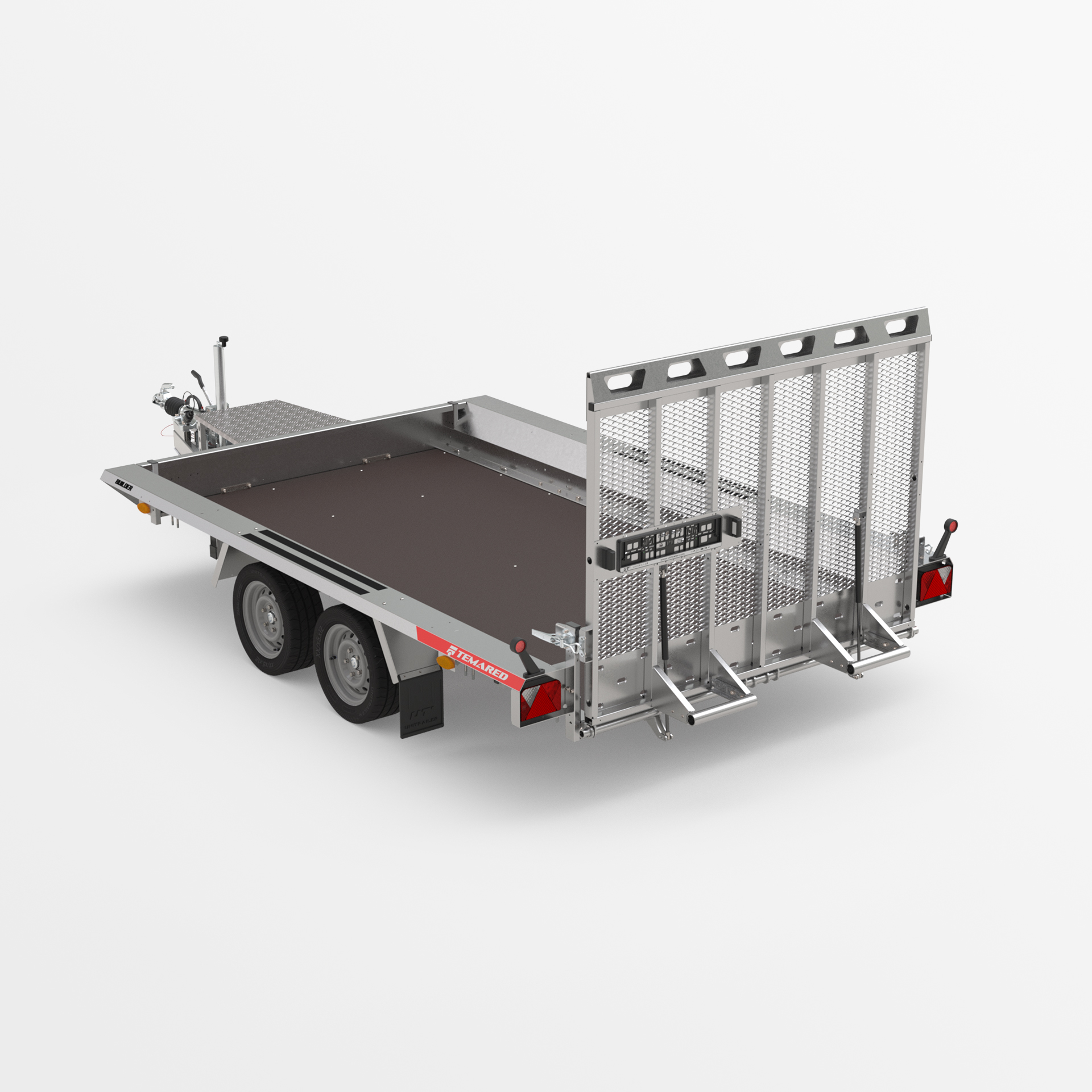 Robuster geschweißter Anhänger für den Transport von Baumaschinen und sehr schweren Materialien. Das originelle Design bietet