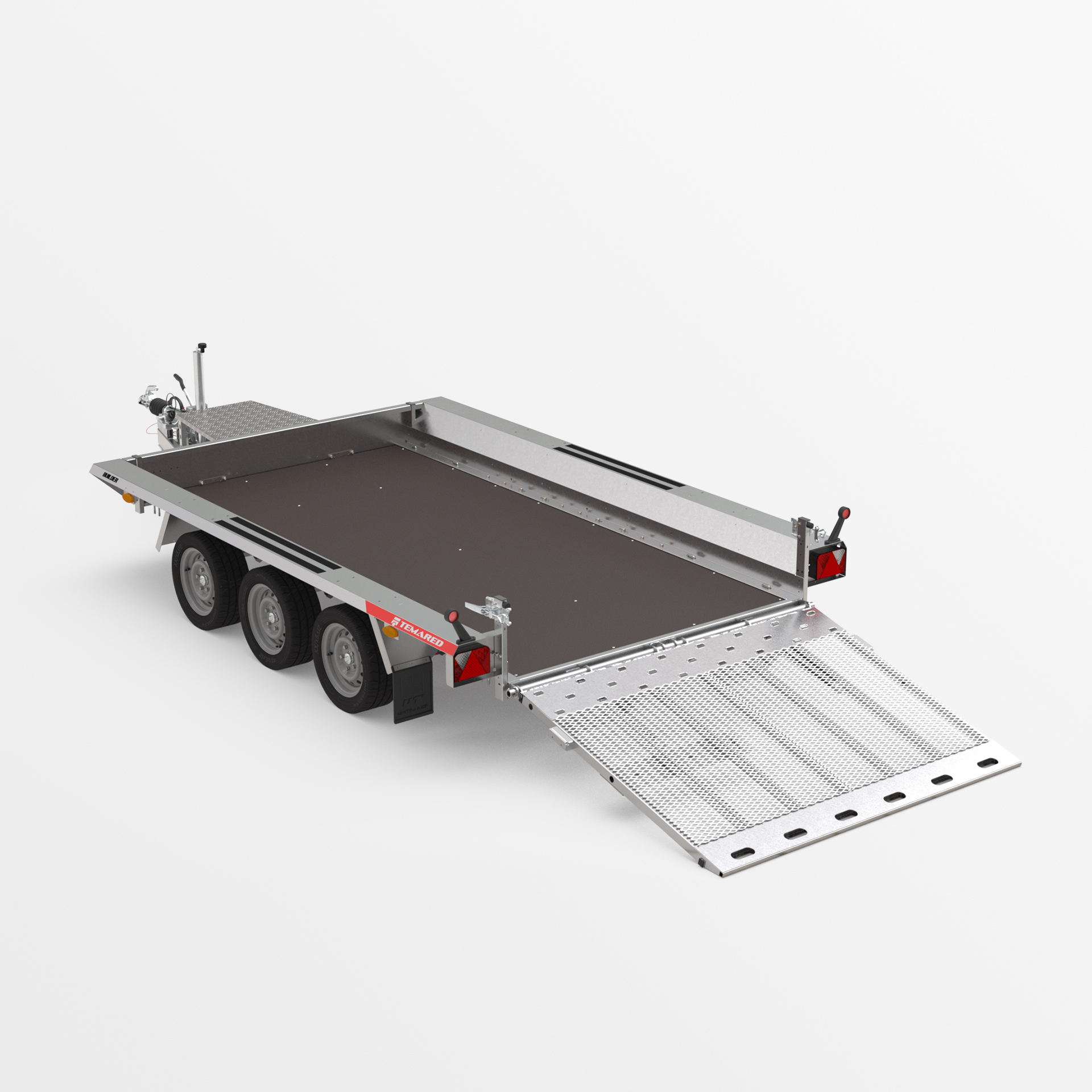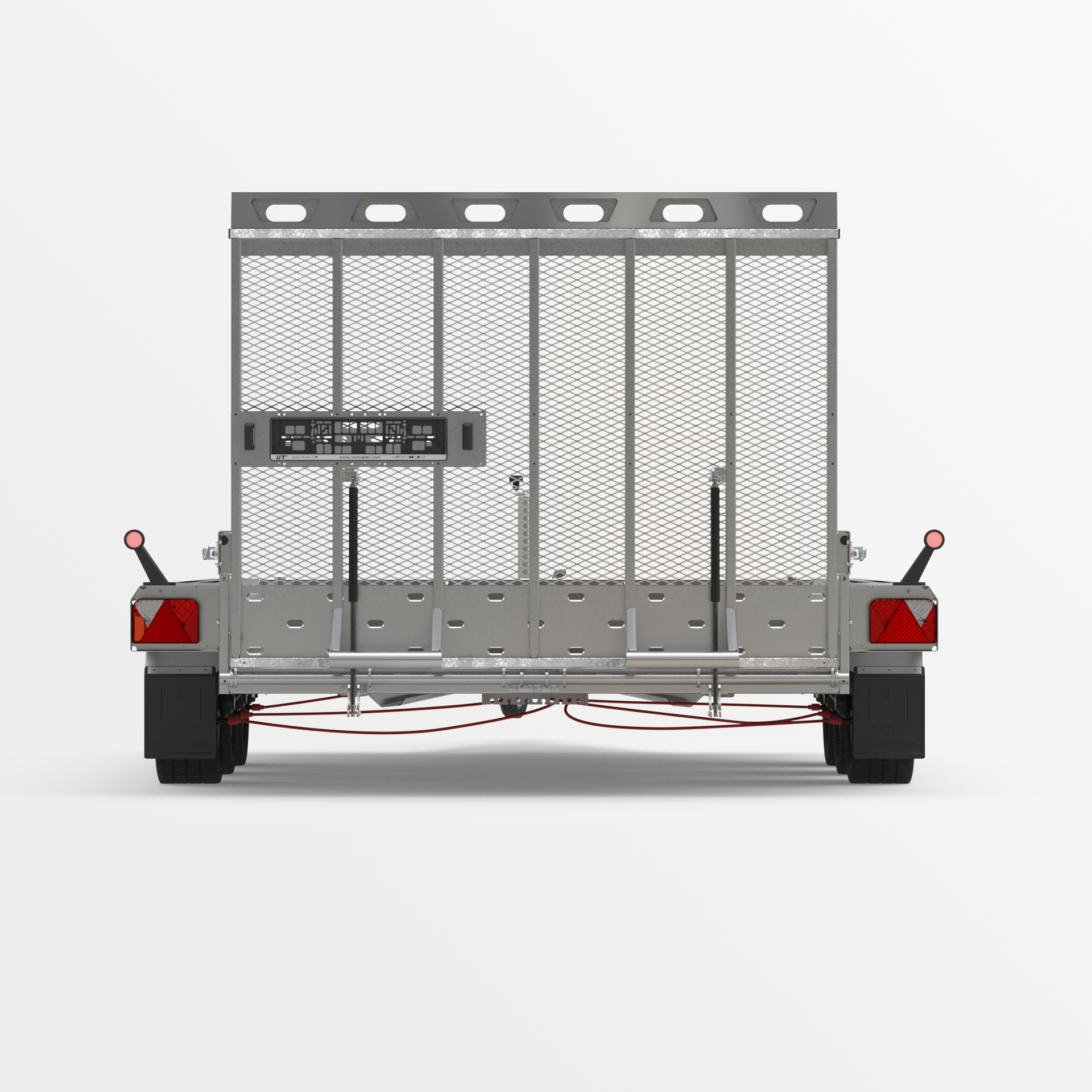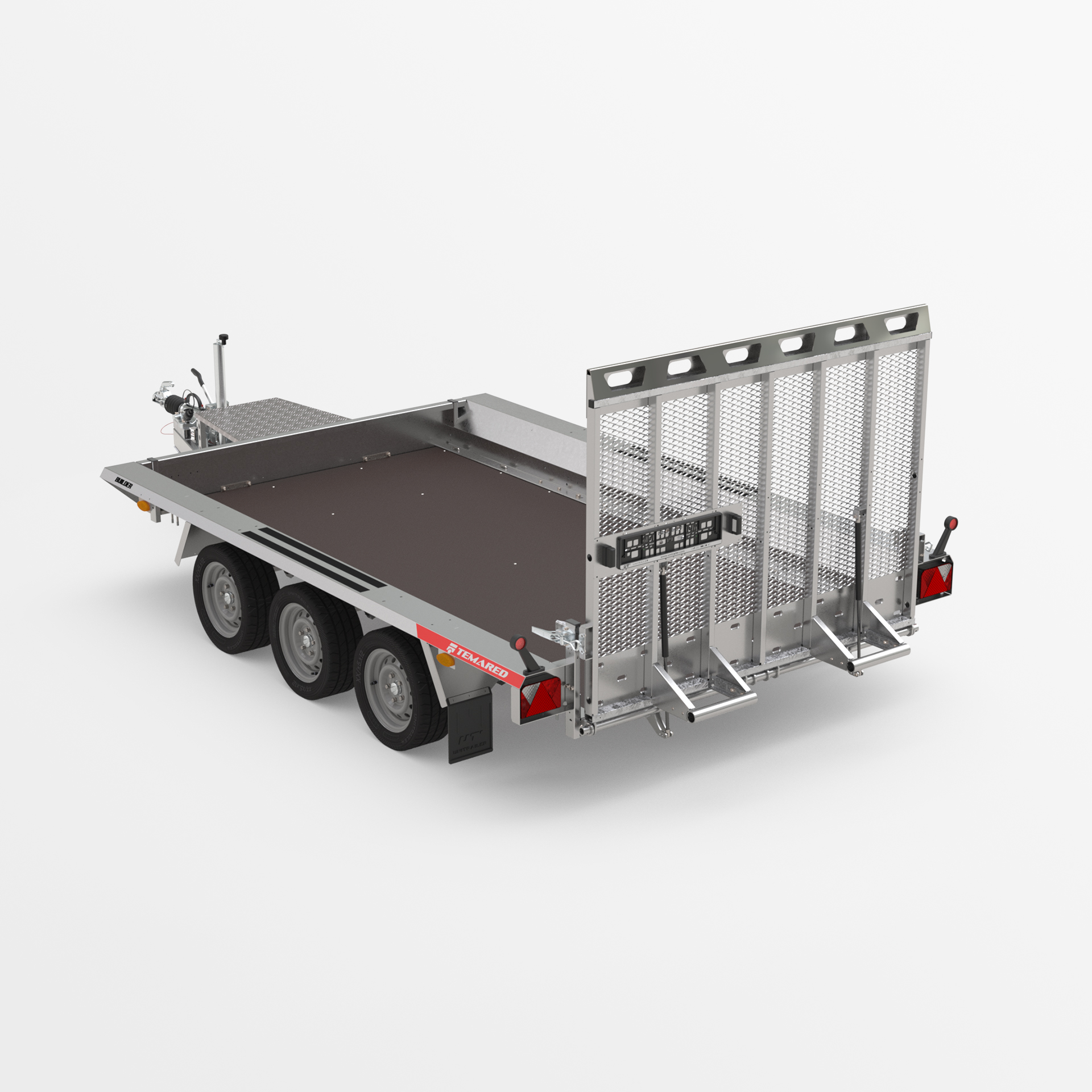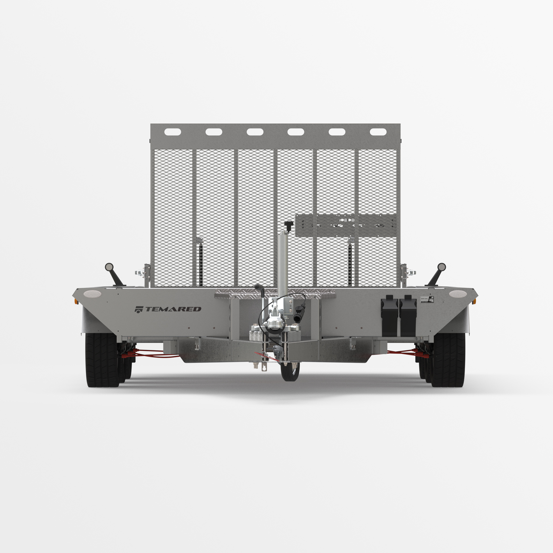 Robuster geschweißter Anhänger für den Transport von Baumaschinen und sehr schweren Materialien. Das originelle Design bietet die Möglichkeit, auf der gesamten Länge der mit Anti-Rutsch-Streifen ausgestatteten Seiten zu gehen. Geschweißter, tragender Rahmen aus geschlossenen Stahlprofilen. Rutschfester, wasserfester Sperrholzboden mit soliden Bodenklammern zur Ladungssicherung, um die Sicherheit der transportierten Güter zu gewährleisten. Äußerst robuste V-Deichsel und stabilisierende Auflaufstützen. Sitzbankstütze und Stützrad mit automatischer Klappung serienmäßig. Federn, die das Absenken und Anheben der Rampe erleichtern. Es besteht die Möglichkeit, die breite Unterfahrrampe durch zwei Unterfahrrampen zu ersetzen, wodurch das Gewicht des Anhängers verringert und die Nutzlast erhöht wird.