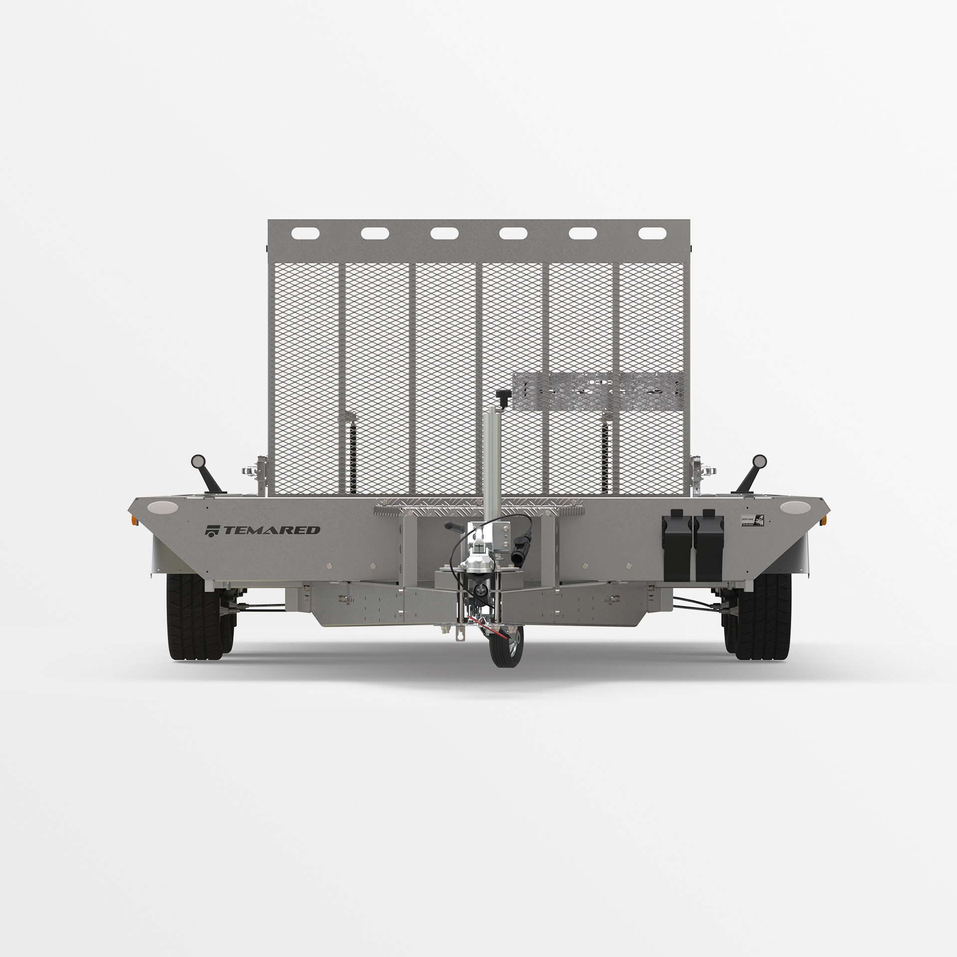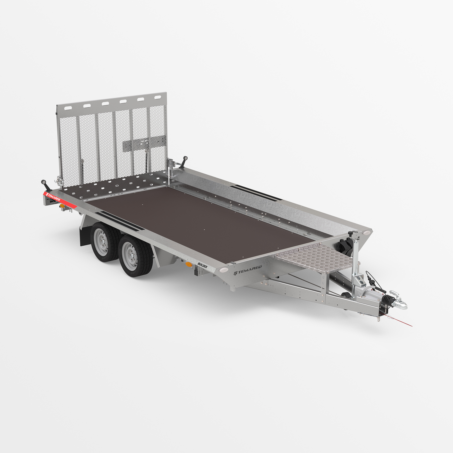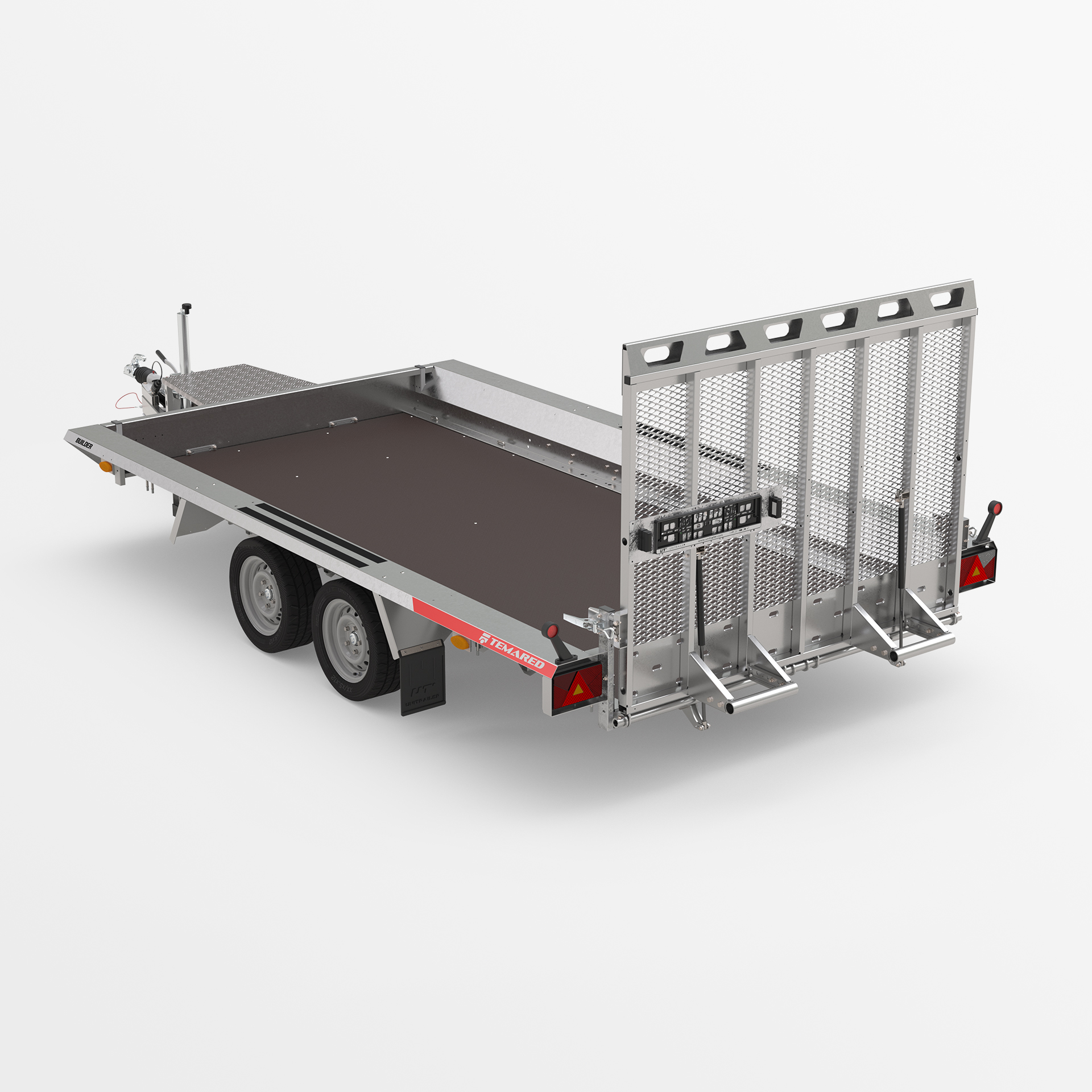 Robuster geschweißter Anhänger für den Transport von Baumaschinen und sehr schweren Materialien. Das originelle Design bietet die Möglichkeit, auf der gesamten Länge der mit Anti-Rutsch-Streifen ausgestatteten Seiten zu gehen. Geschweißter, tragender Rahmen aus geschlossenen Stahlprofilen. Rutschfester, wasserfester Sperrholzboden mit soliden Bodenklammern zur Ladungssicherung, um die Sicherheit der transportierten Güter zu gewährleisten. Äußerst robuste V-Deichsel und stabilisierende Auflaufstützen. Sitzbankstütze und Stützrad mit automatischer Klappung serienmäßig. Federn, die das Absenken und Anheben der Rampe erleichtern. Es besteht die Möglichkeit, die breite Unterfahrrampe durch zwei Unterfahrrampen zu ersetzen, wodurch das Gewicht des Anhängers verringert und die Nutzlast erhöht wird.
