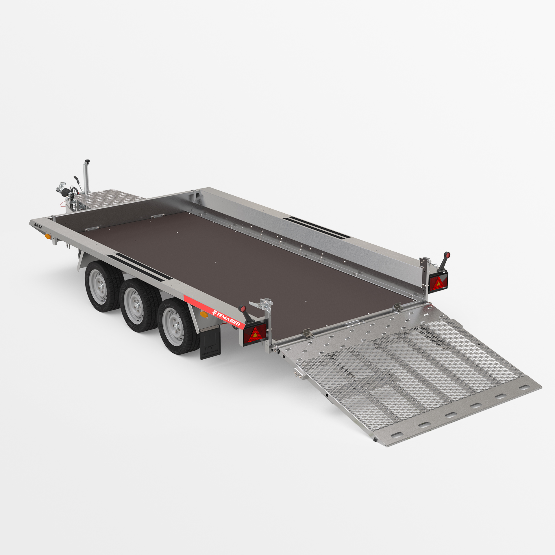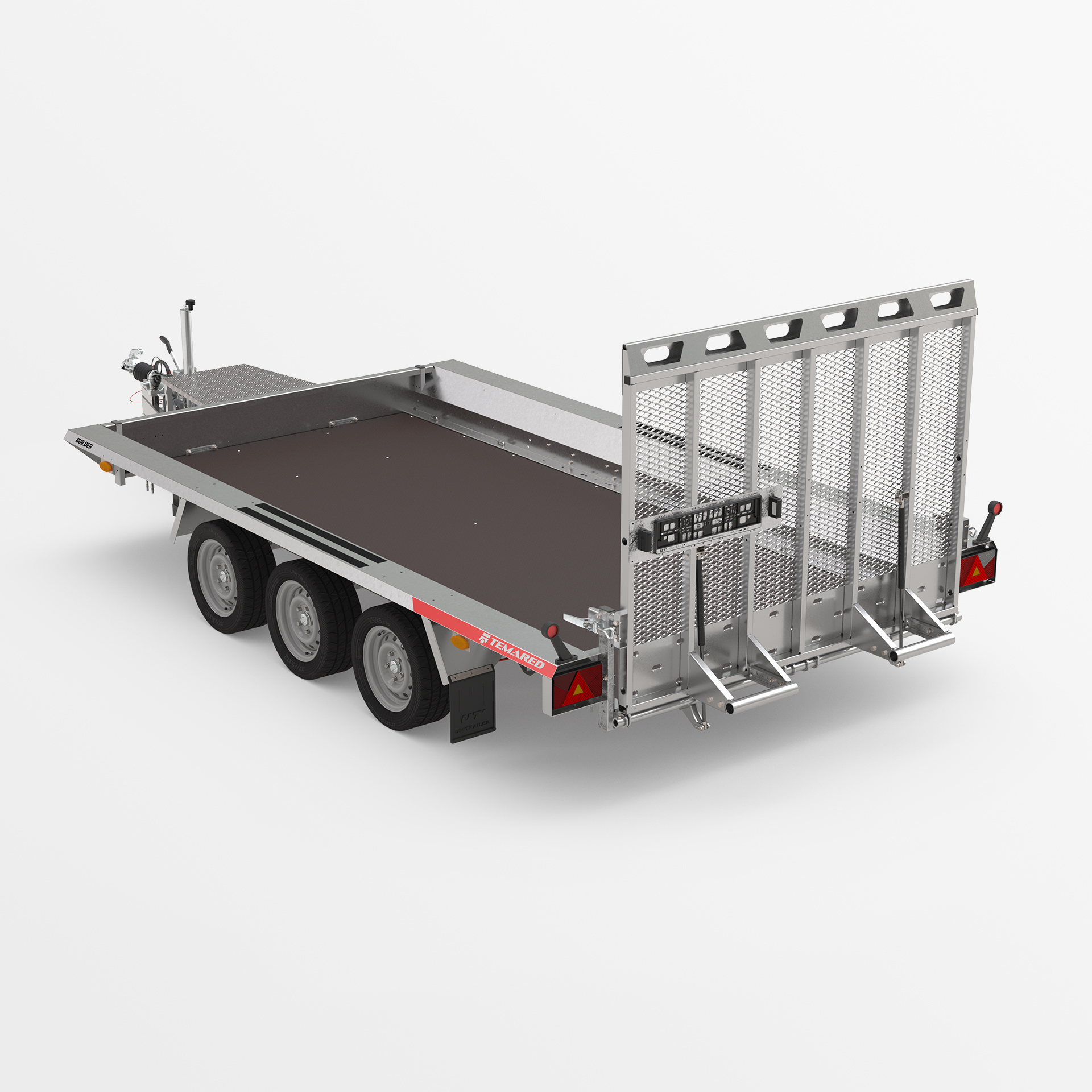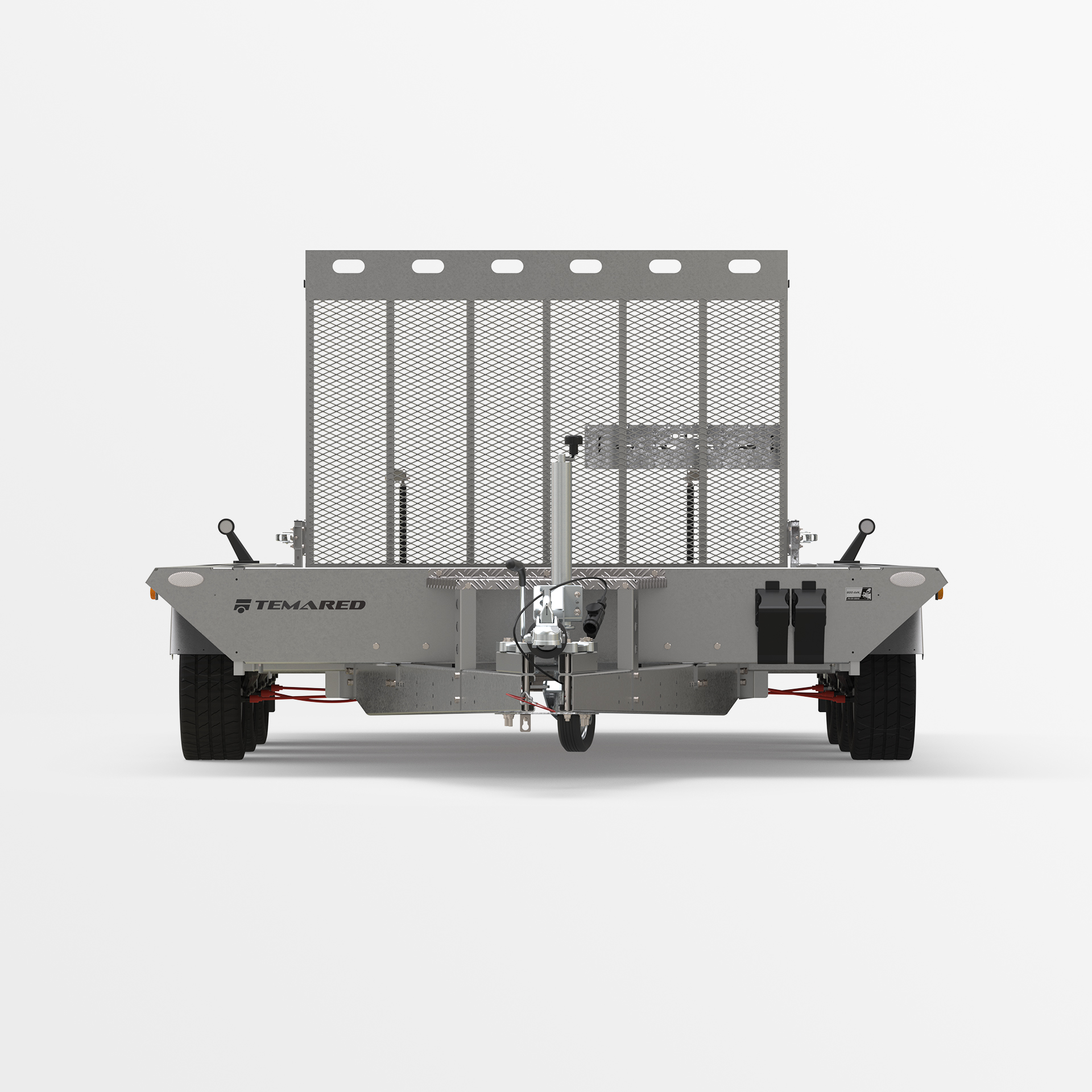 Robuster geschweißter Anhänger für den Transport von Baumaschinen und sehr schweren Materialien. Das originelle Design bietet