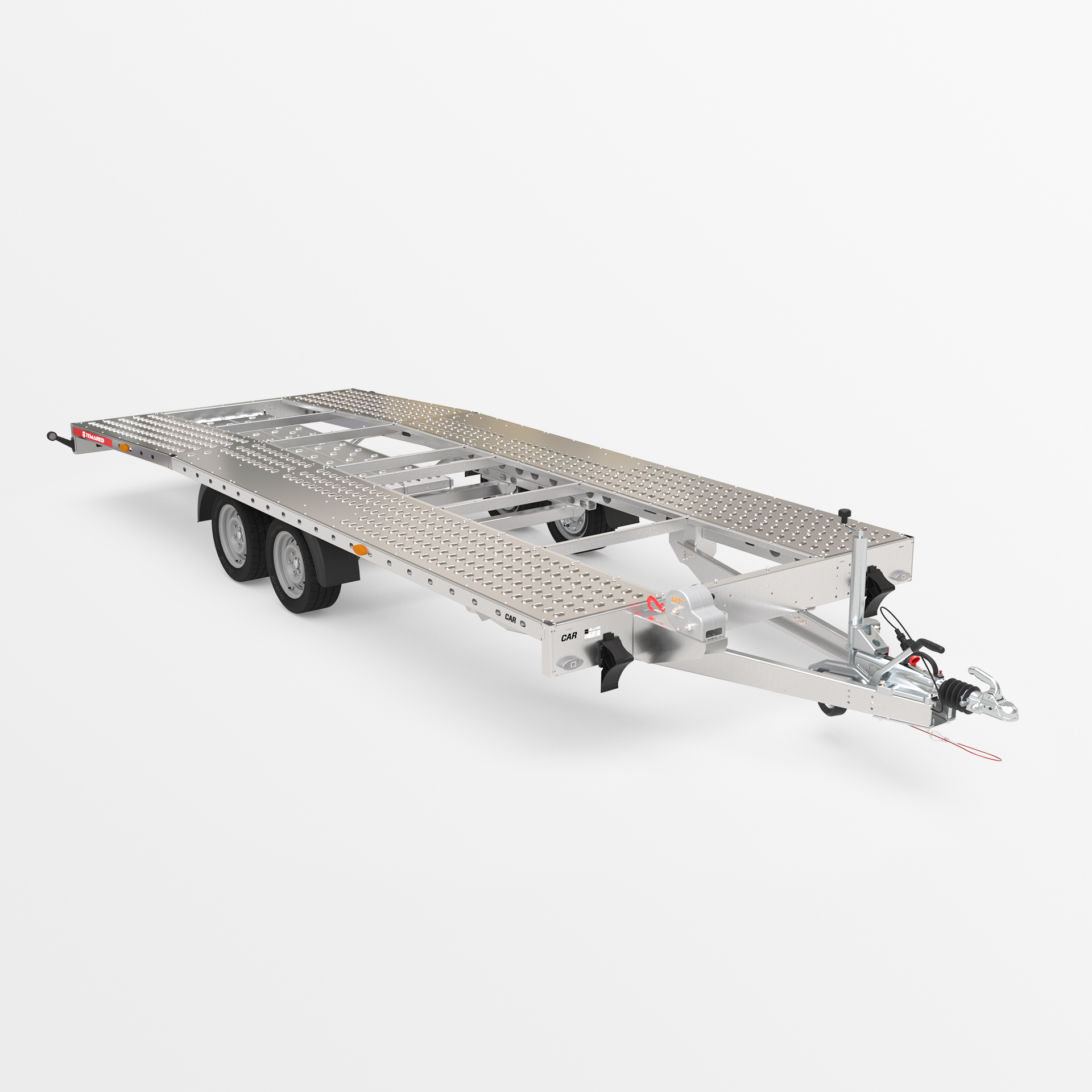 Anhänger für den Fahrzeugtransport mit stabiler, geschweißter Konstruktion. Ausgestattet mit einem automatischen Stützrad, zahlreichen Zurrpunkten, einer Winde zur Erleichterung des Beladens, Stahl-Auffahrrampen und Radkeilen.