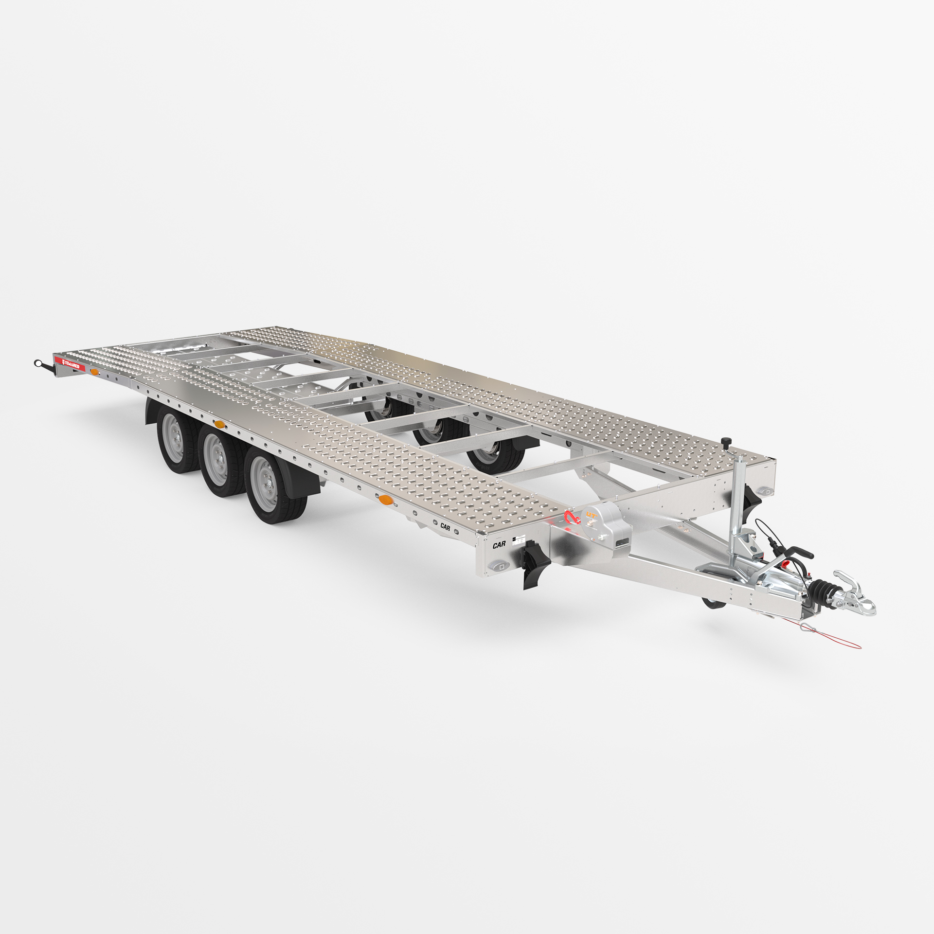 Anhänger für den Fahrzeugtransport mit stabiler, geschweißter Konstruktion. Ausgestattet mit einem automatischen Stützrad, zahlreichen Zurrpunkten, einer Winde zur Erleichterung des Beladens, Stahl-Auffahrrampen und Radkeilen.