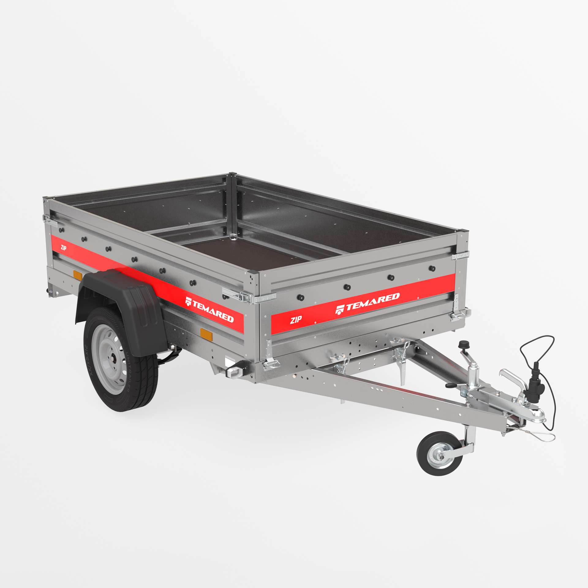Transportanhänger, der für den sicheren Transport verschiedener Lasten konzipiert wurde. Mit einer 40 cm hohen Bordwand sowie klappbaren vorderen und hinteren Bordwänden wird das Be- und Entladen schnell und bequem. Die geschweißte Konstruktion sorgt für hohe Haltbarkeit, während die kippbare Deichsel den Nutzungskomfort verbessert. Anschläge am hinteren Rahmen ermöglichen eine stabile Positionierung des Anhängers auf der hinteren Bordwand, sodass er beim Lagern nur wenig Platz benötigt.