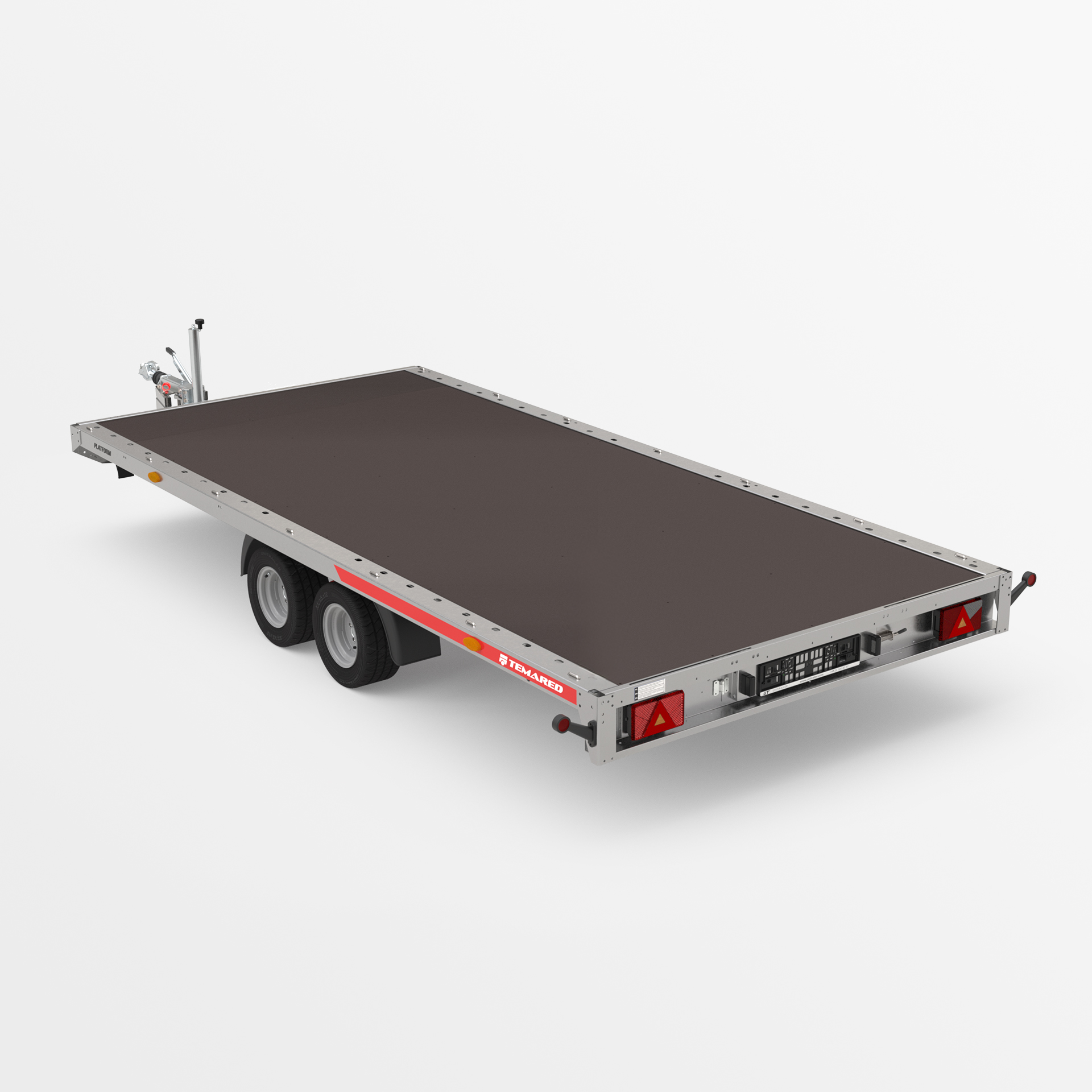 A universal flat platform equipped with an automatic jockey wheel, waterproof anti-slip plywood, and tie-down points integrated into the longitudinal beams. The low loading height ensures a convenient, stable, and safe loading and transport process. Available in many different sizes and with optional additional equipment.