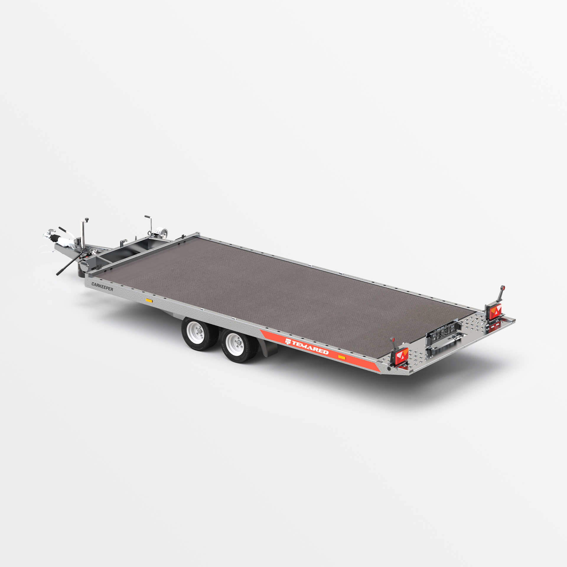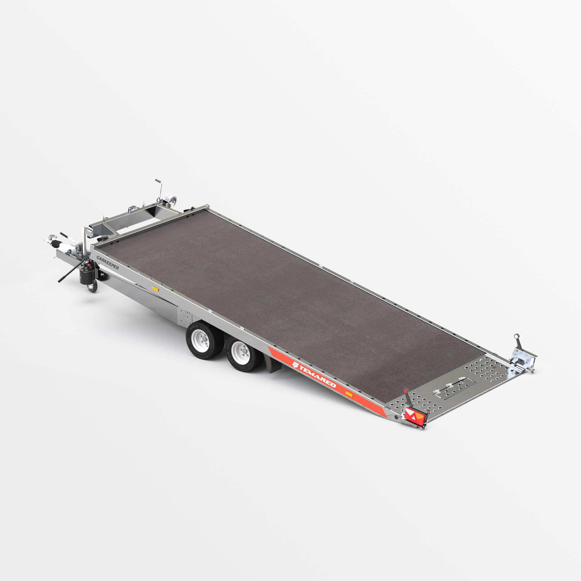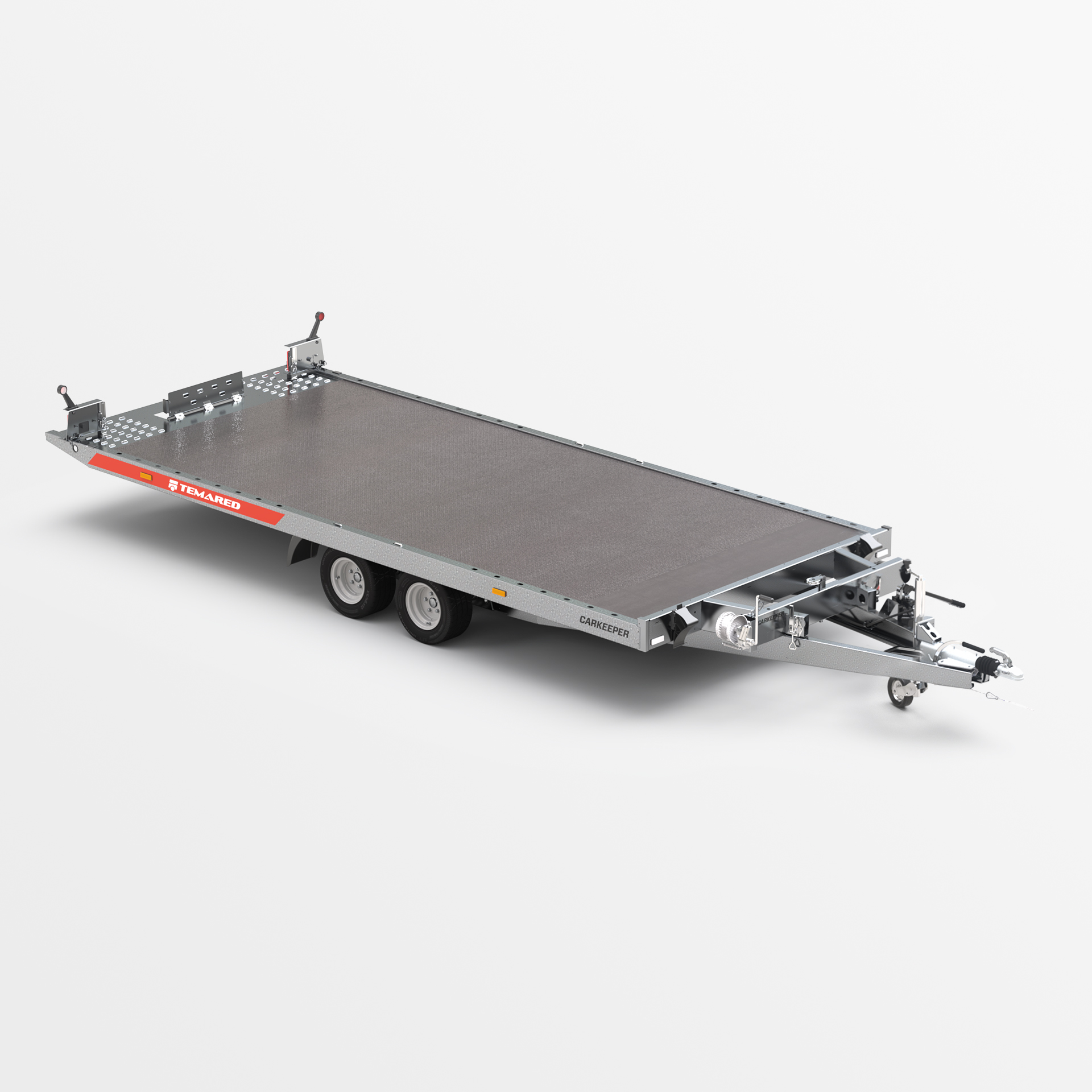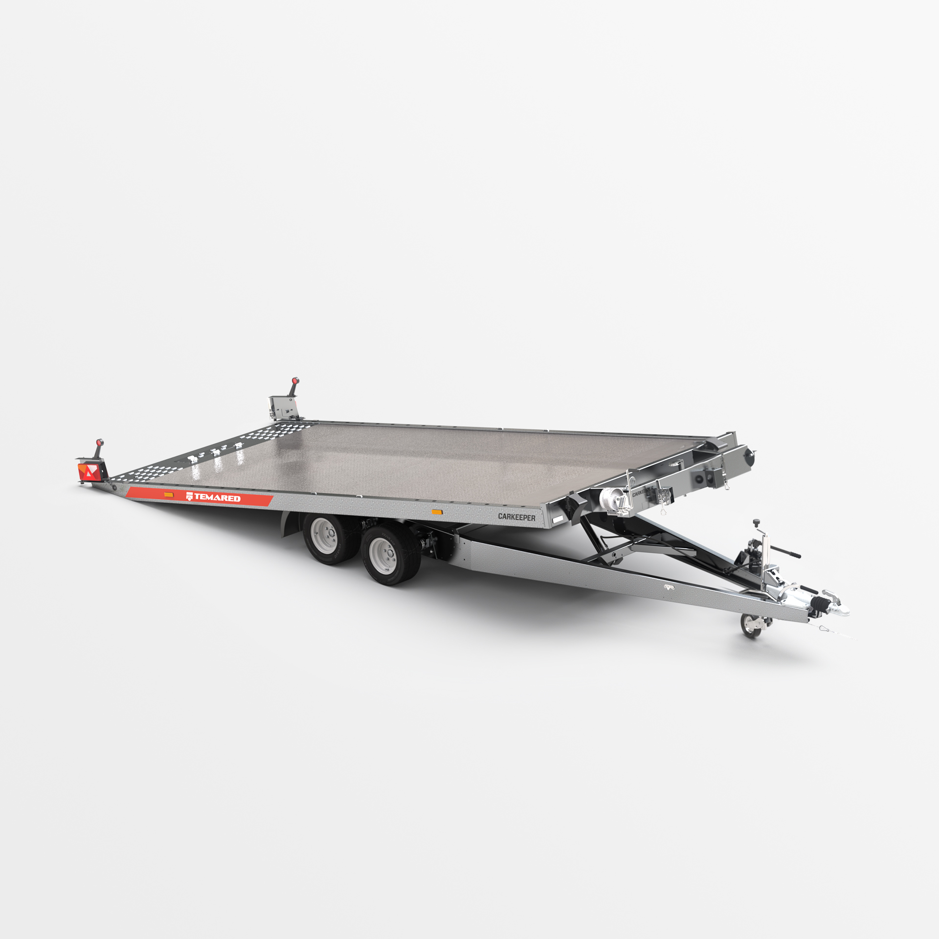 Remolque para automóvil equipado con función de superficie de transporte inclinable. El cilindro hidráulico utilizado garantiza un funcionamiento suave y sencillo durante la carga. El bajo ángulo de salida de 11° facilita la carga de vehículos con baja distancia al suelo. El robusto bastidor de perfiles cerrados y el carro y la barra de tiro reforzados garantizan seguridad y durabilidad. Las vigas laterales perforadas y el suelo de chapa de Lohr, gracias a los agujeros densamente espaciados, facilitan la sujeción de los vehículos transportados. Numerosas posibilidades de configuración del relleno, como por ejemplo chapa ondulada de aluminio sobre madera contrachapada, chapa ondulada de aluminio o panel de aluminio, permiten adaptar el remolque a sus necesidades individuales. Opcionalmente, el remolque puede equiparse con iluminación LED completa. Esta es la solución perfecta para las empresas que buscan equipos de transporte de automóviles confiables.