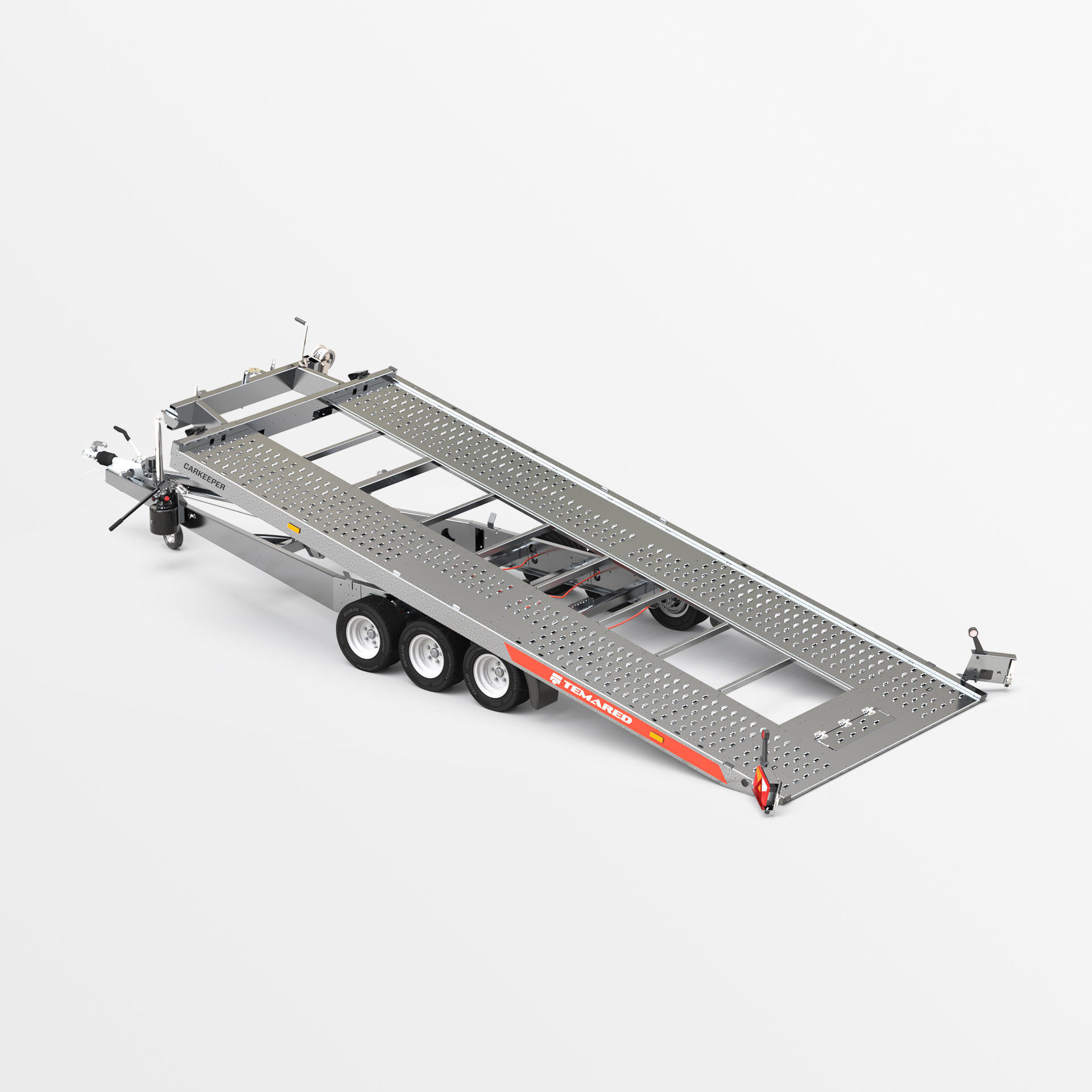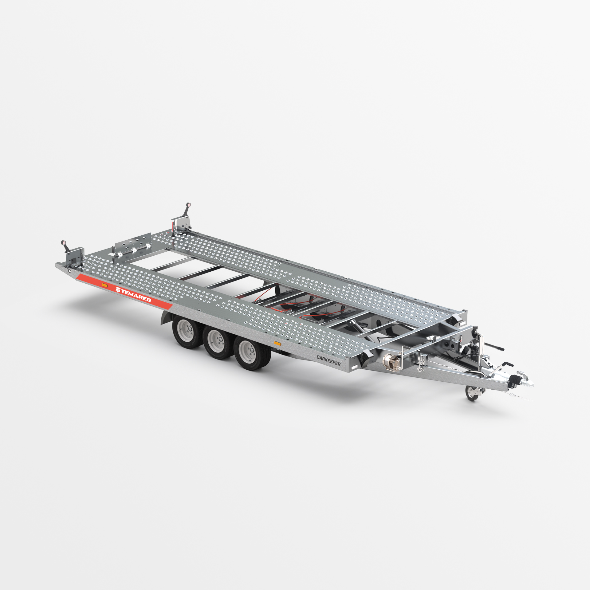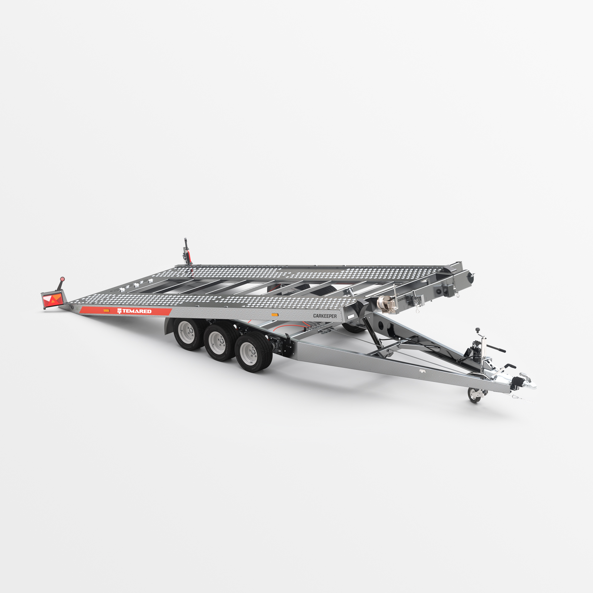 Remolque para automóviles equipado con una función de vuelco para la superficie de transporte. El cilindro hidráulico utilizado garantiza un funcionamiento suave y sencillo durante la carga. El bajo ángulo de salida de 11° facilita la carga de vehículos con poca distancia al suelo. El robusto bastidor de sección hueca y el bogie y la barra de tracción reforzados garantizan la seguridad y la durabilidad. Los largueros laterales con aberturas y el suelo de chapa Lohr, gracias a sus aberturas densamente espaciadas, facilitan la sujeción de los vehículos transportados. Las numerosas variantes de configuración del relleno, como chapa ondulada de aluminio sobre contrachapado, chapa ondulada de aluminio o panel de aluminio, permiten adaptar el remolque a las necesidades individuales. Como opción, el remolque puede equiparse con iluminación LED completa. Es ideal para empresas que buscan un equipo fiable para el transporte de automóviles.