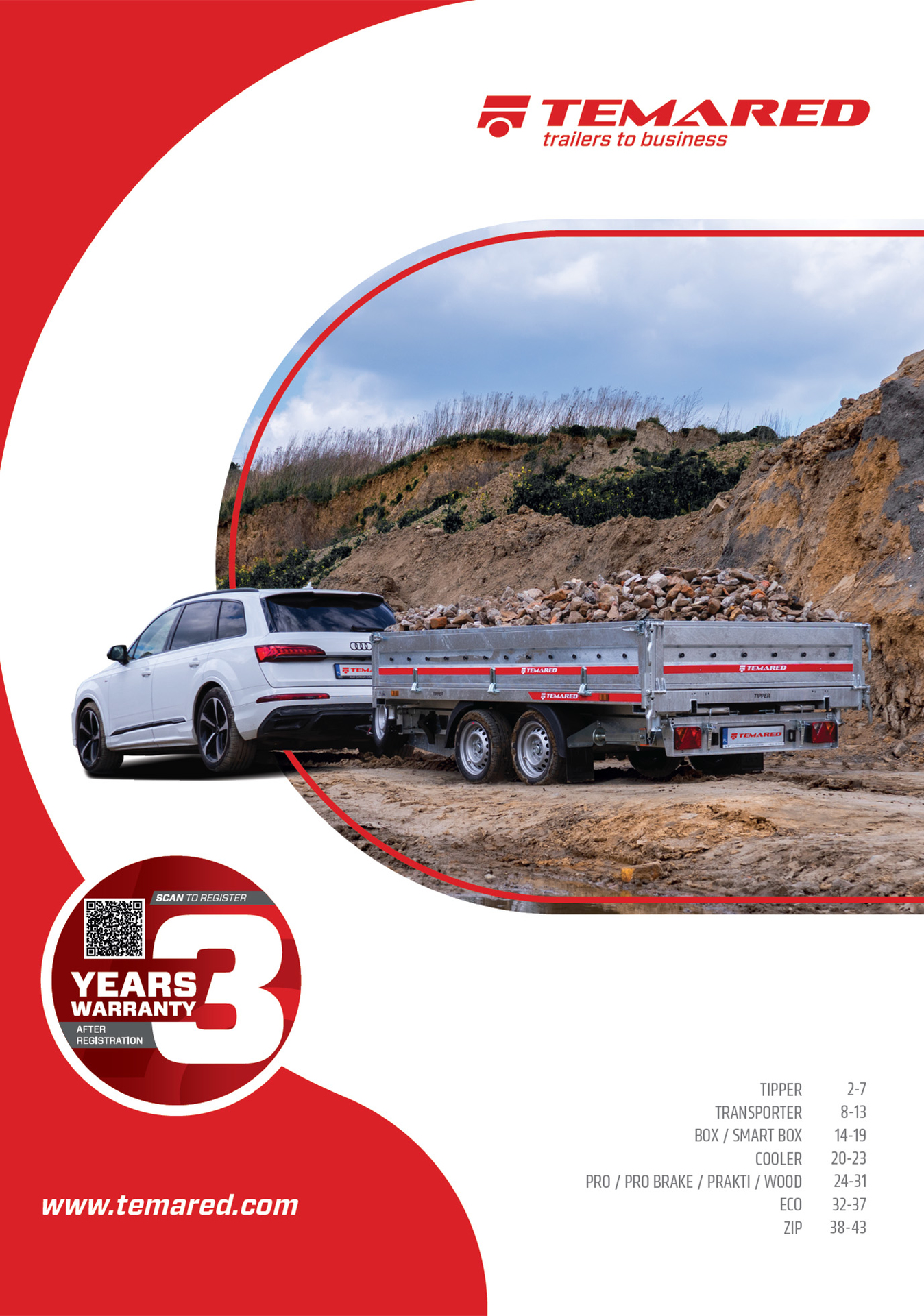 Catálogo con los modelos de remolque: TIPPER, TRANSPORTER, BOX,SMART BOX, COOLER, PRO, PRO BRAKE, PRAKTI, WOOD, ECO