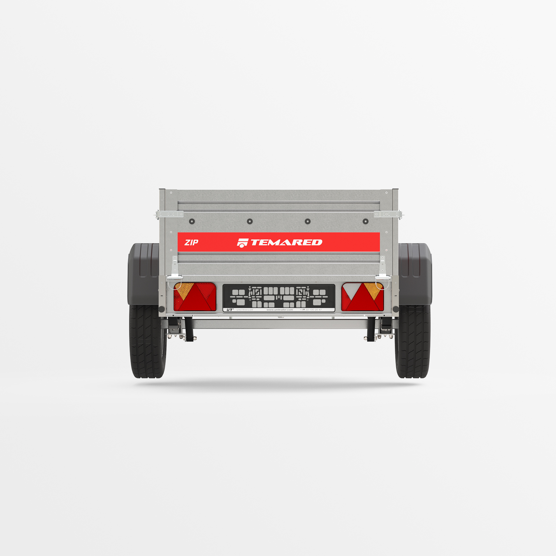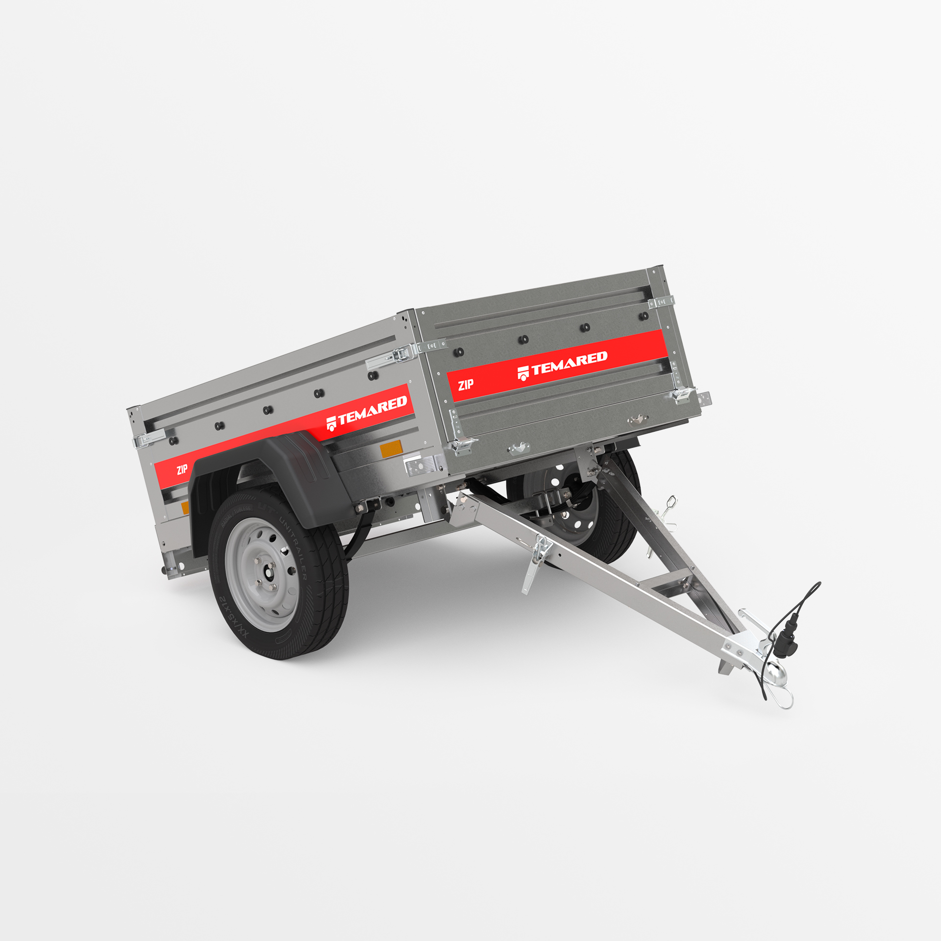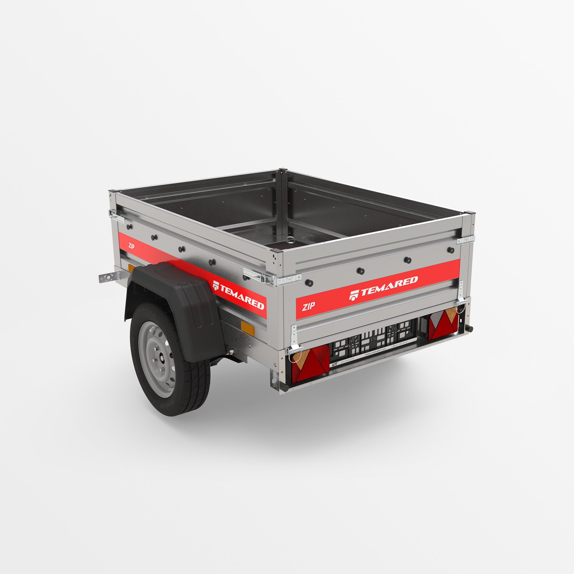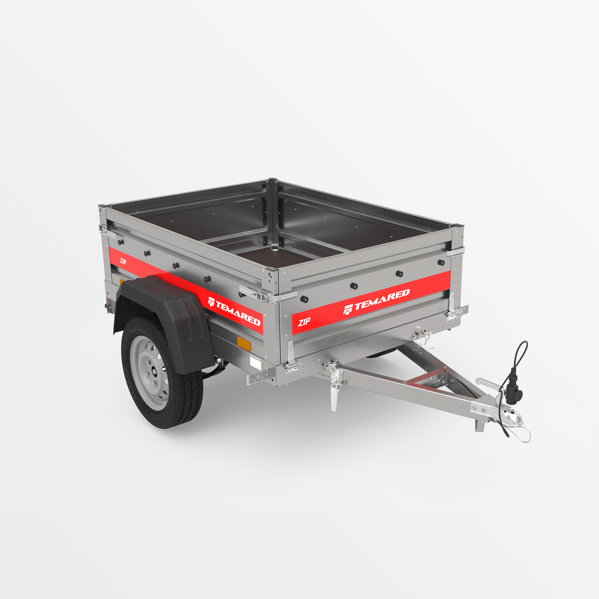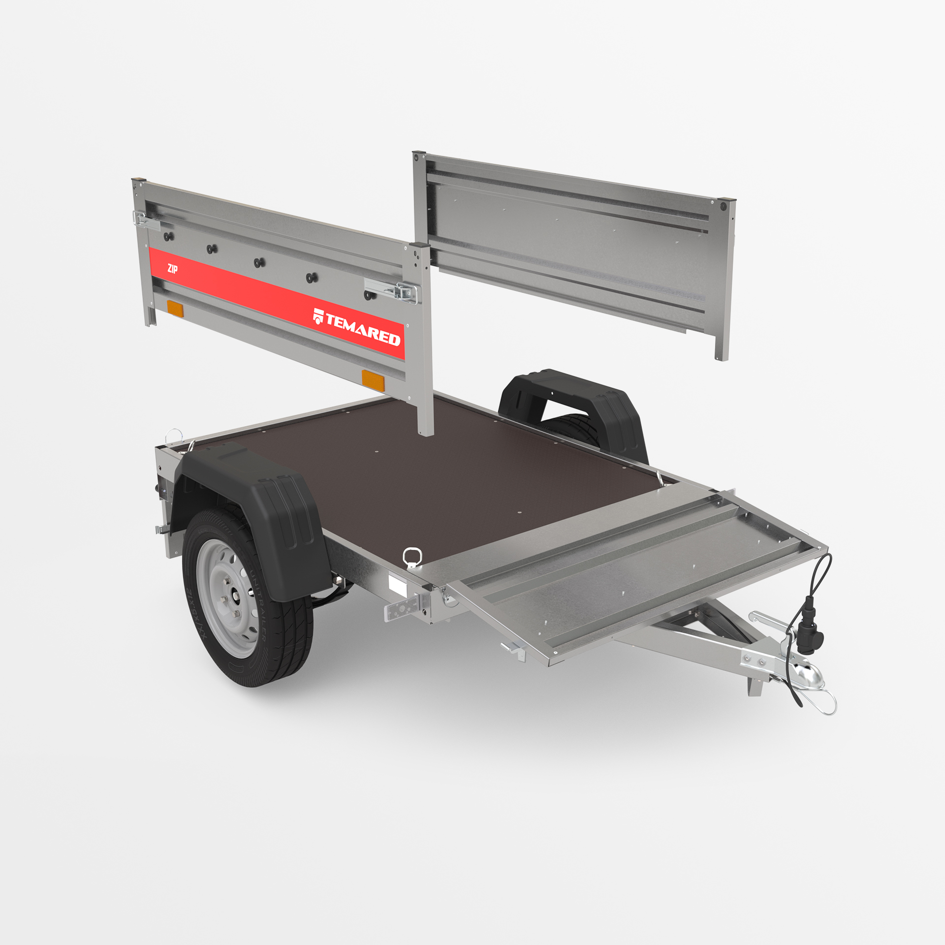 Remolque de transporte disenado para el traslado seguro de diversas cargas. Con un lateral de 40 cm de altura y laterales abatibles en la parte delantera y trasera, la carga y descarga son rápidas y cómodas. La estructura soldada garantiza una alta durabilidad, mientras que el timón abatible mejora la comodidad de uso. Los topes en el bastidor trasero proporcionan una posición estable del remolque sobre su lateral trasero, permitiendo que ocupe poco espacio durante su almacenamiento.
