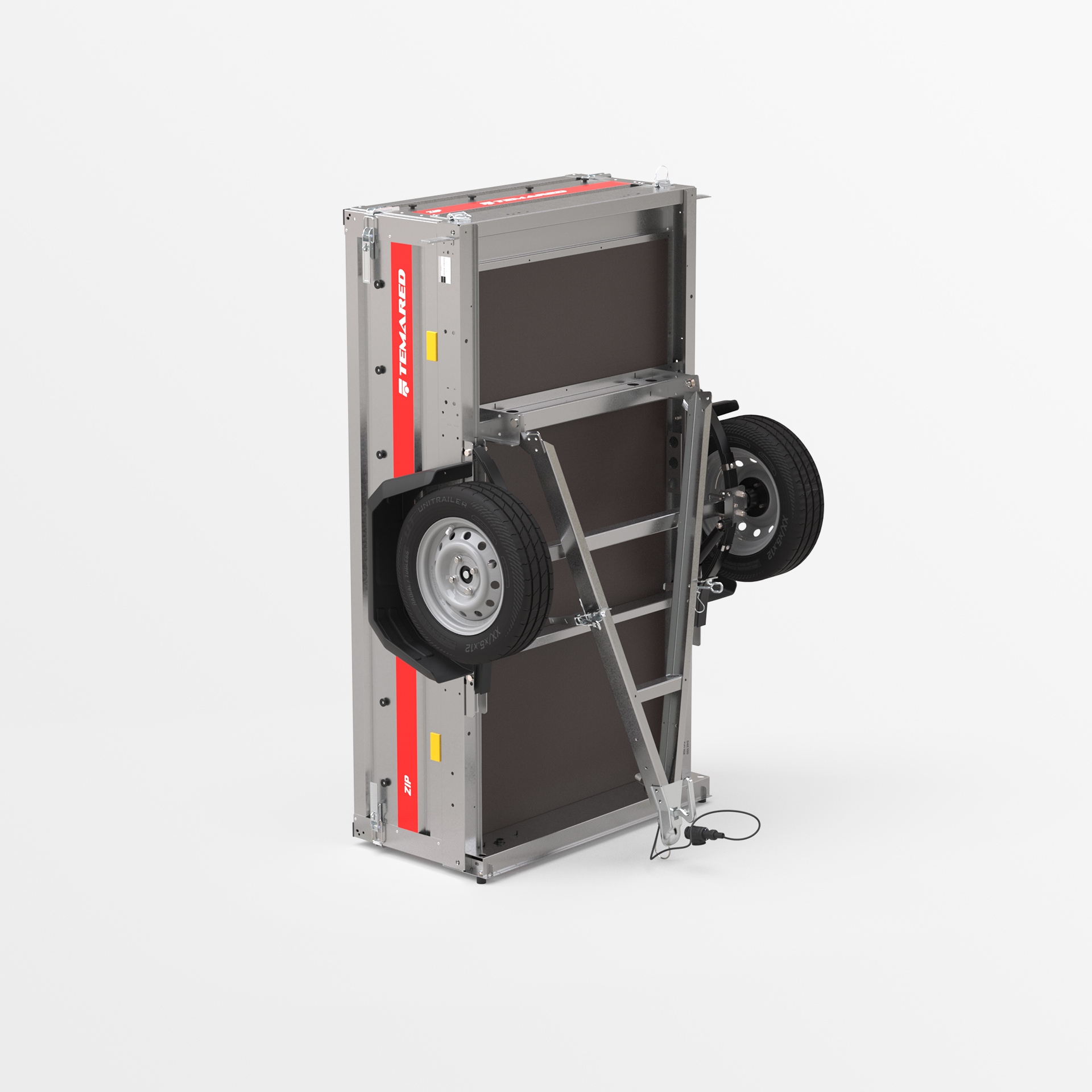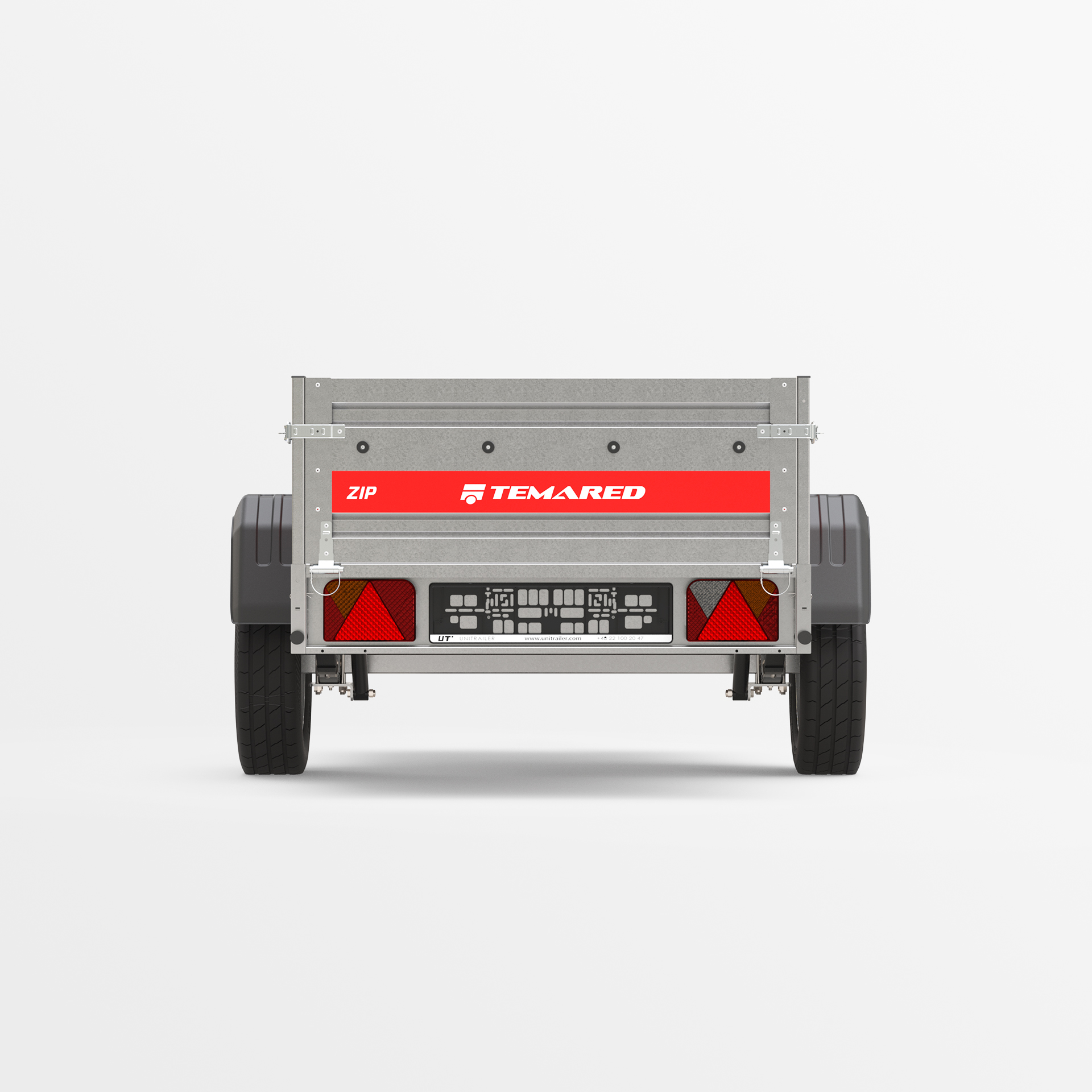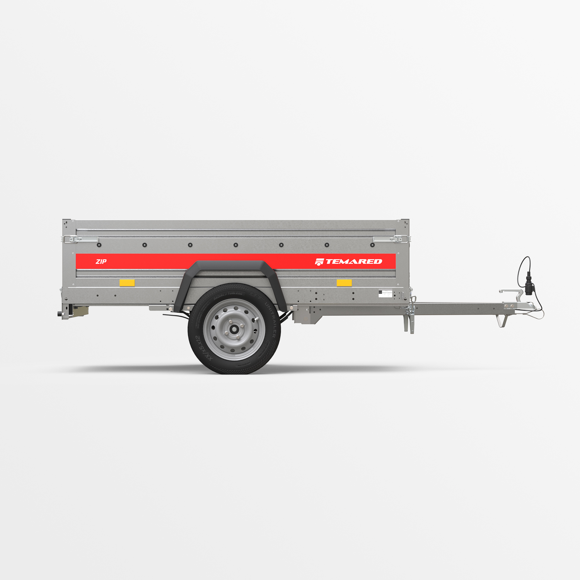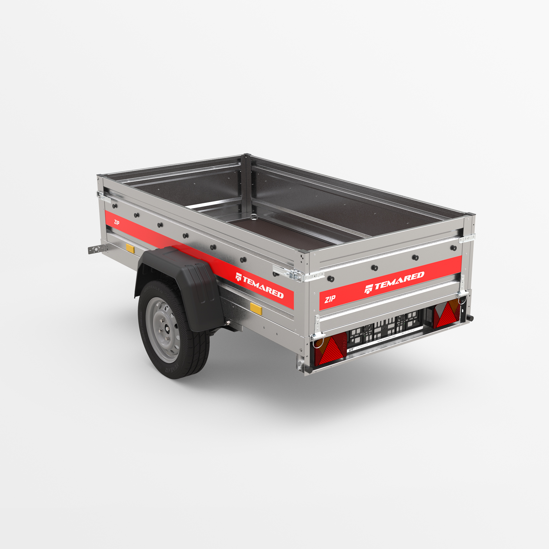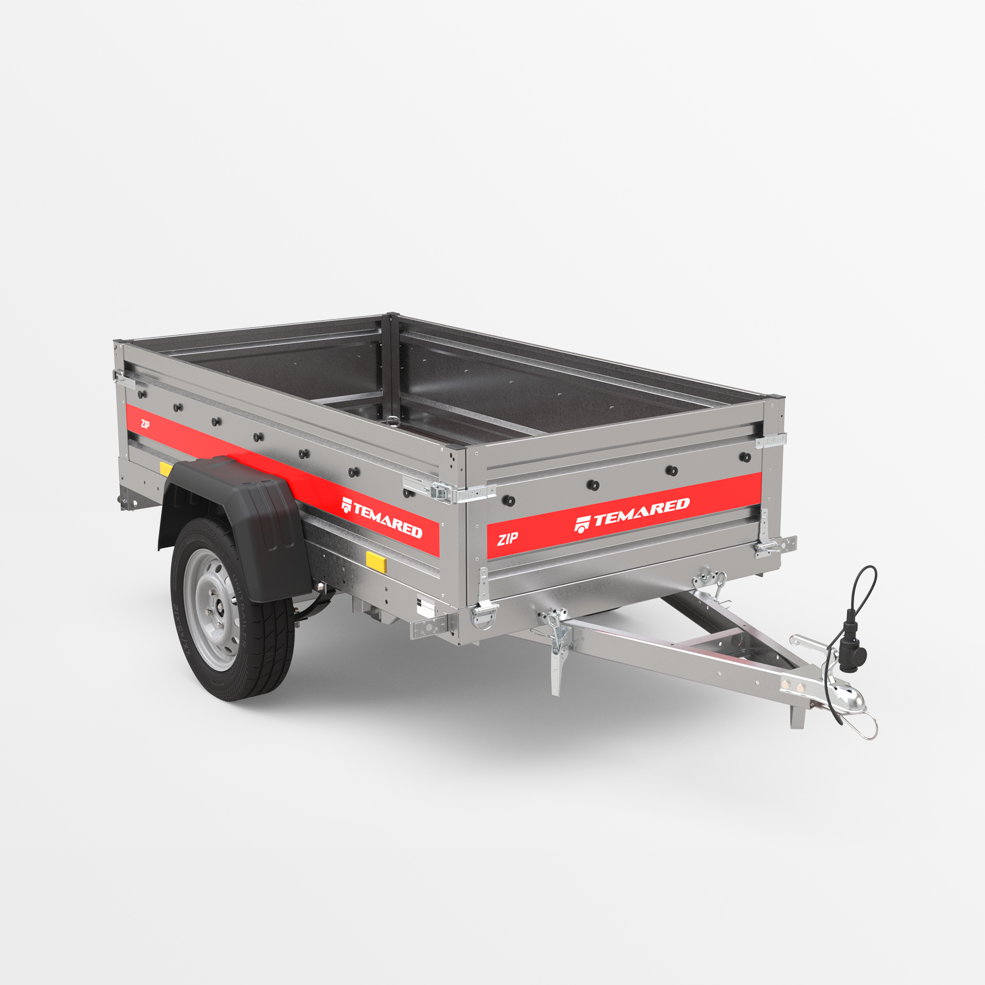 Remolque de transporte disenado para el traslado seguro de diversas cargas. Con un lateral de 40 cm de altura y laterales abatibles en la parte delantera y trasera, la carga y descarga son rápidas y cómodas. La estructura soldada garantiza una alta durabilidad, mientras que el timón abatible mejora la comodidad de uso. Los topes en el bastidor trasero proporcionan una posición estable del remolque sobre su lateral trasero, permitiendo que ocupe poco espacio durante su almacenamiento.