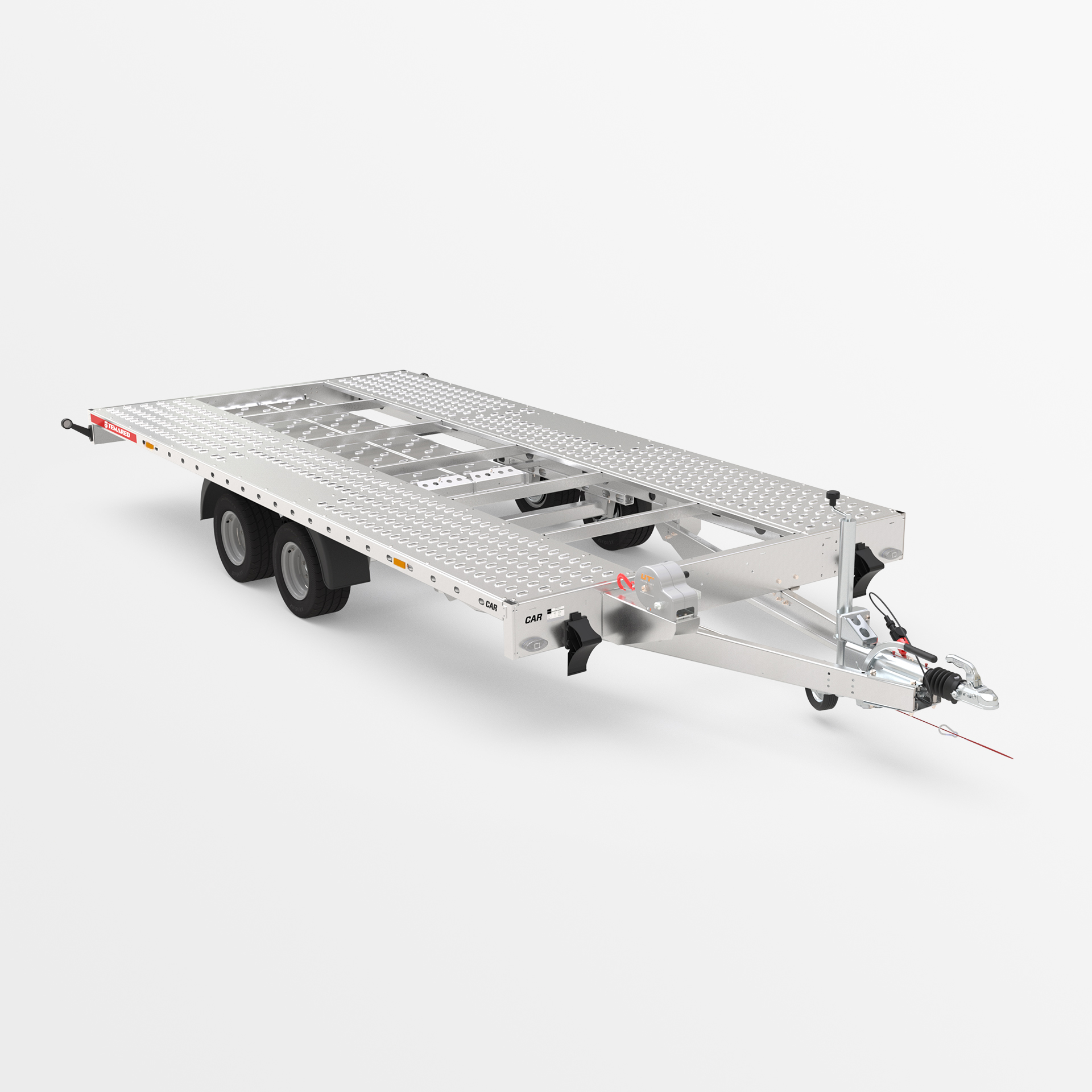 Remorque pour le transport de véhicules avec une structure soudée solide. Équipée d'une roue jockey automatique, de nombreux points d'arrimage, d’un treuil facilitant le chargement, de rampes en acier et de cales de roue.