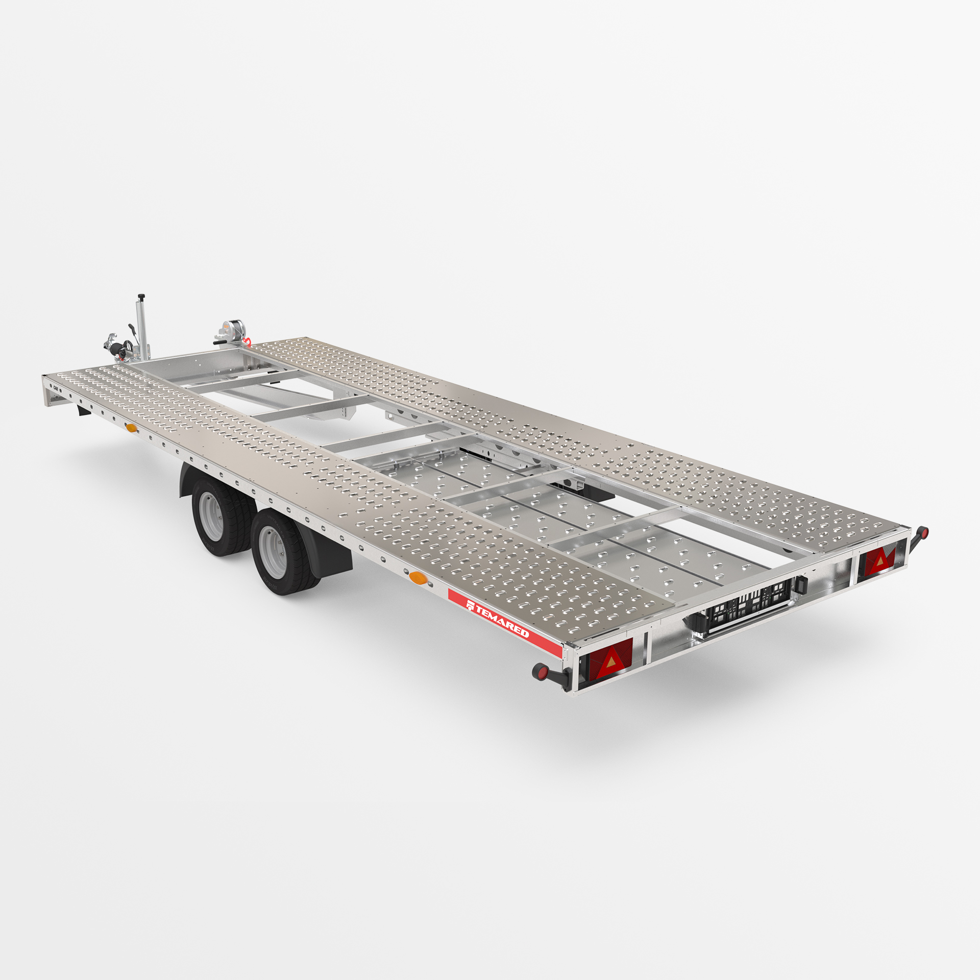Remorque pour le transport de véhicules avec une structure soudée solide. Équipée d'une roue jockey automatique, de nombreux points d'arrimage, d’un treuil facilitant le chargement, de rampes en acier et de cales de roue.