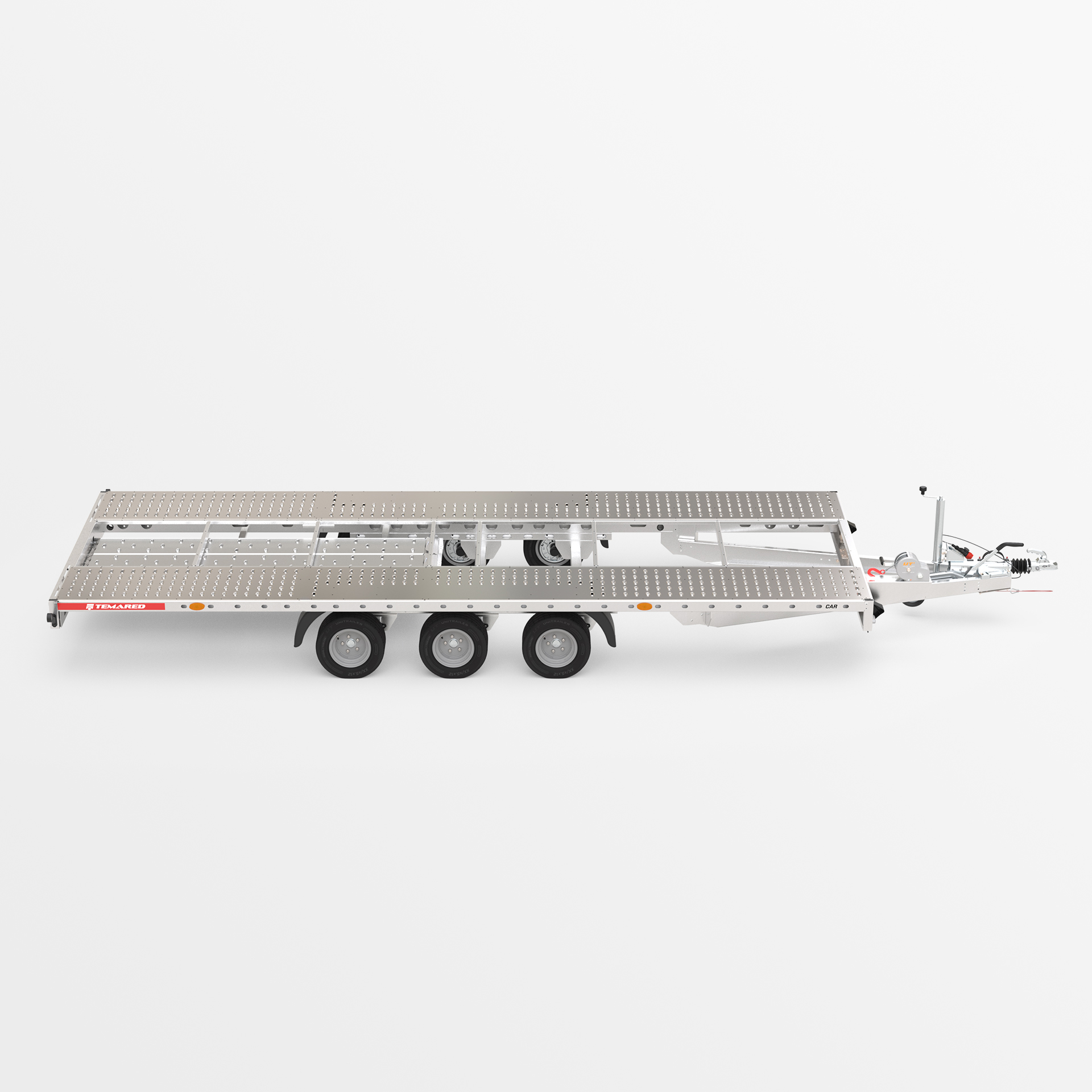Remorque pour le transport de véhicules avec une structure soudée solide. Équipée d'une roue jockey automatique, de nombreux points d'arrimage, d’un treuil facilitant le chargement, de rampes en acier et de cales de roue.
