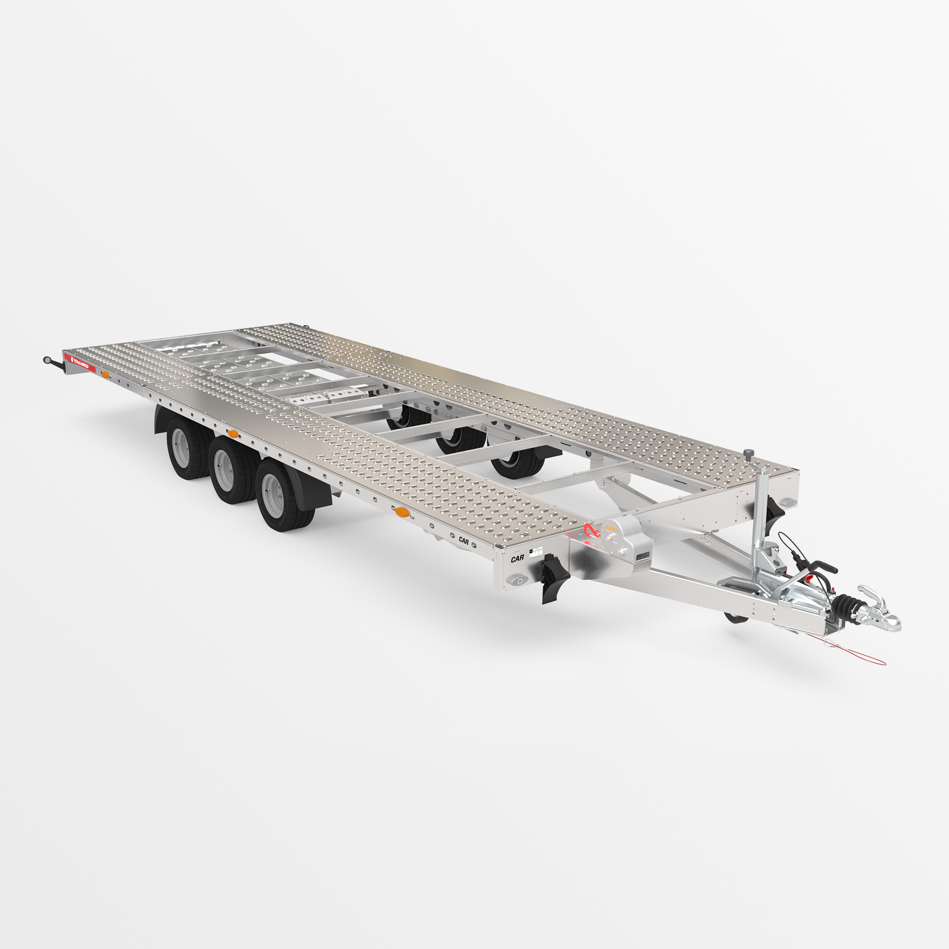Remorque pour le transport de véhicules avec une structure soudée solide. Équipée d'une roue jockey automatique, de nombreux points d'arrimage, d’un treuil facilitant le chargement, de rampes en acier et de cales de roue.