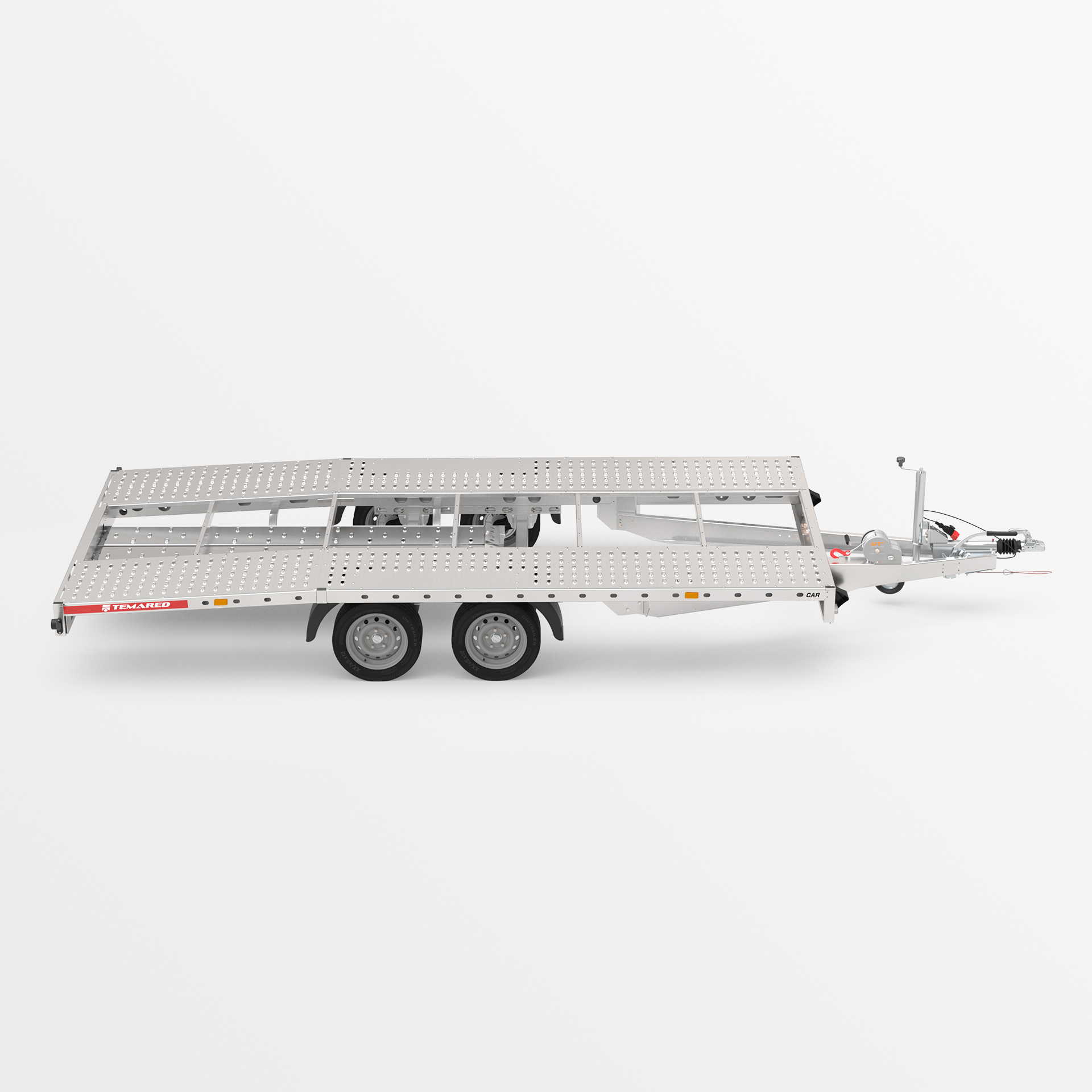 Remorque pour le transport de véhicules avec une structure soudée solide. Équipée d'une roue jockey automatique, de nombreux points d'arrimage, d’un treuil facilitant le chargement, de rampes en acier et de cales de roue.