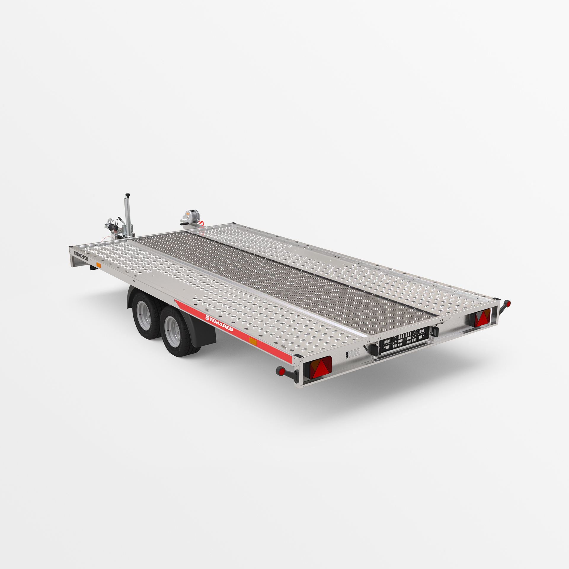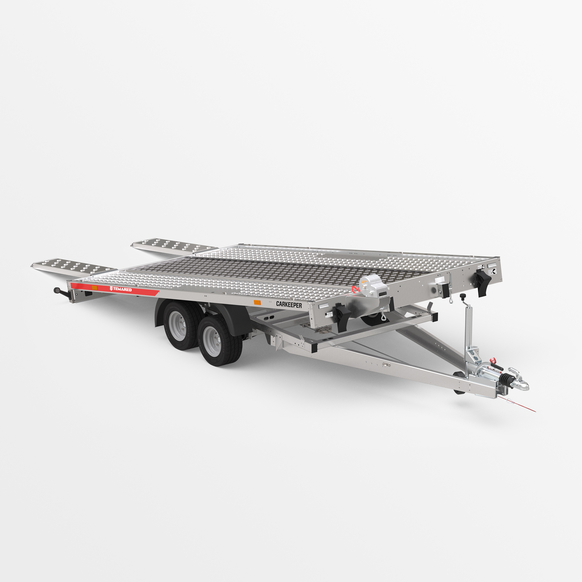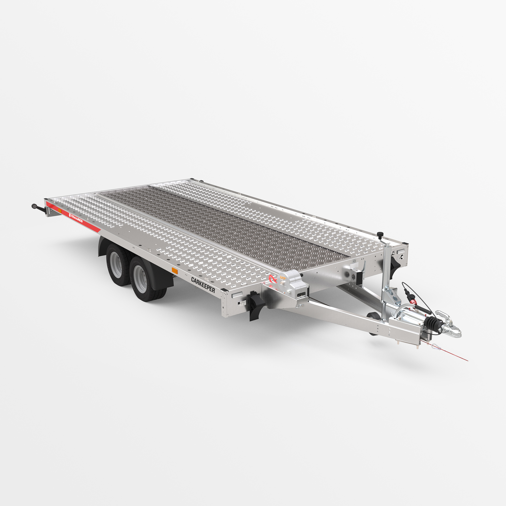 Remorque porte-voitures avec une plateforme de chargement basculante. Un faible angle de rampe (6°) permet de charger facilement des véhicules a faible garde au sol. Les rampes sont dissimulées sous la surface de transport. La plateforme a été élargie de 109 mm pour une meilleure compatibilité avec différents types de véhicules. Les variantes de plancher disponibles sont en tôle d'acier ou en aluminium – sans contreplaqué. Un perçage oblong plus dense permet l'utilisation de plus de points d'arrimage. Des ridelles en aluminium et une structure avec bâche sont disponibles en option.