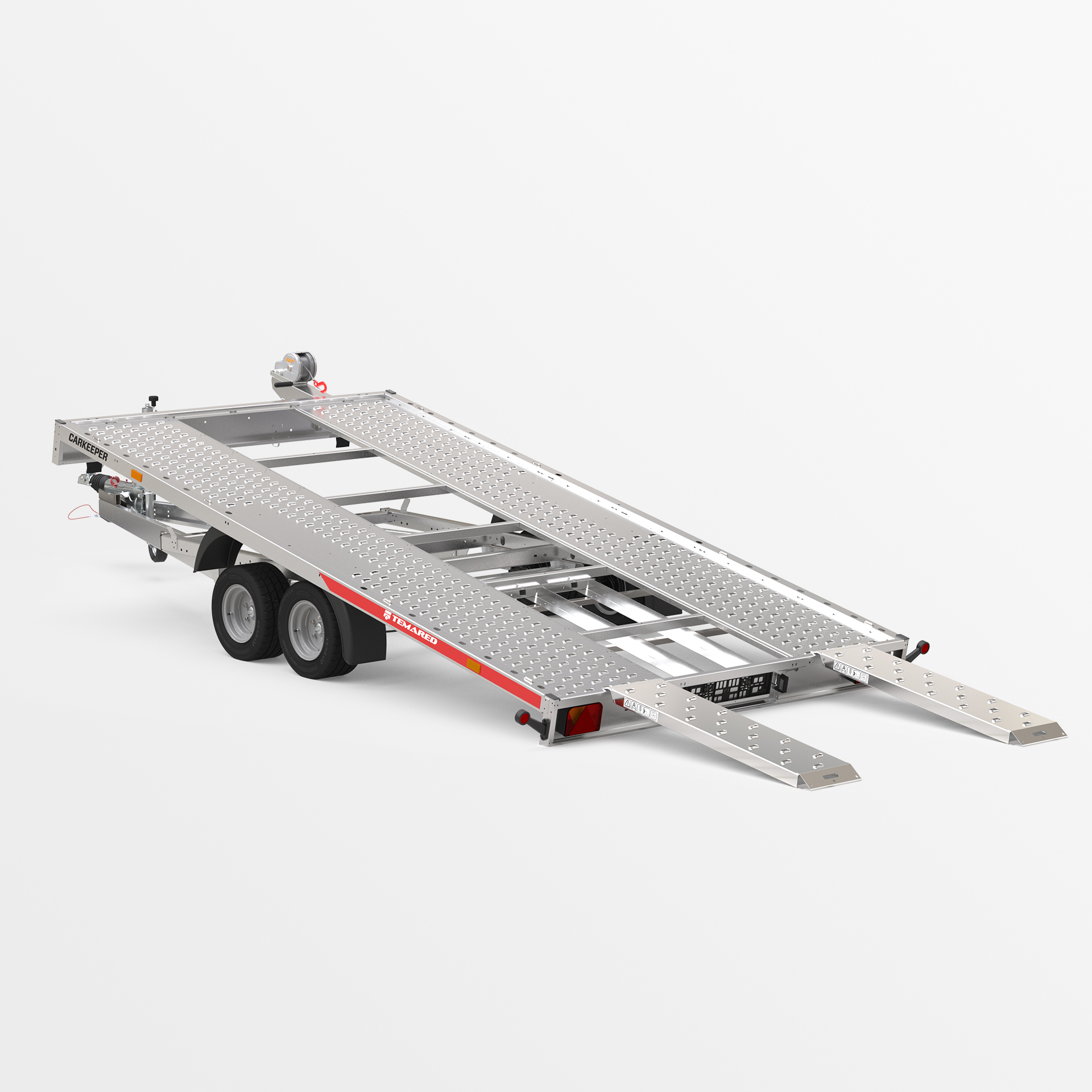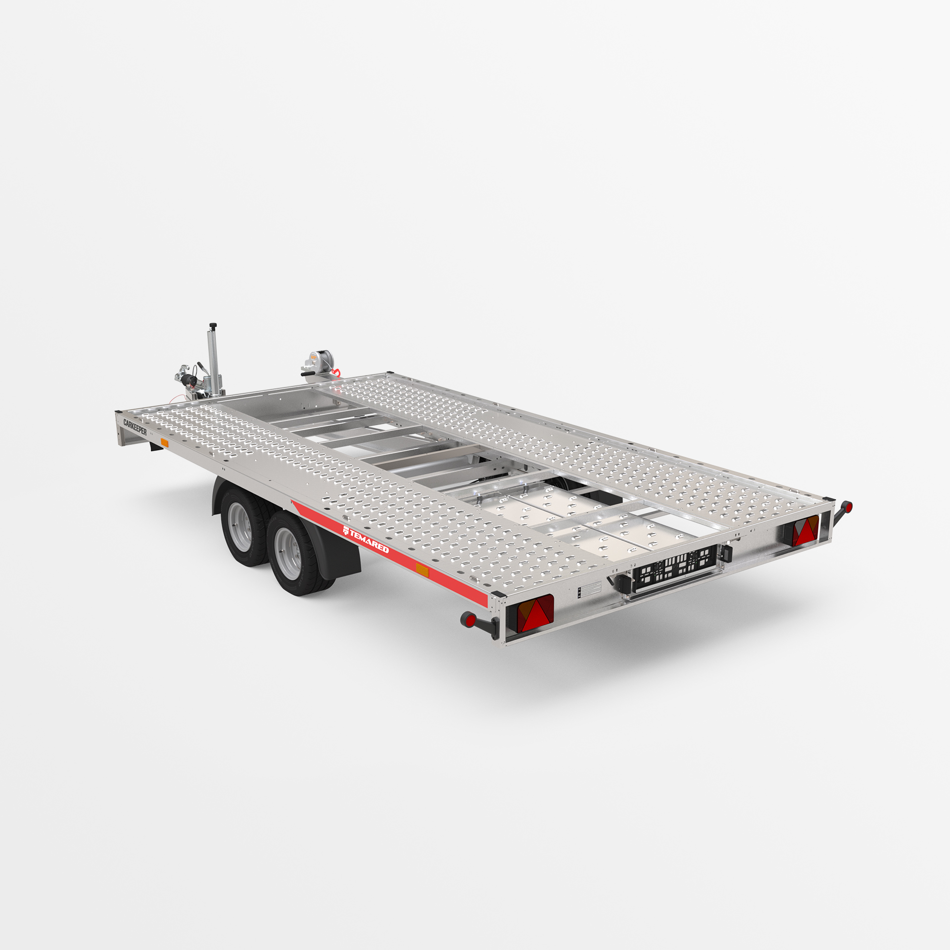 Remorque porte-voitures avec une plateforme de chargement basculante. Un faible angle de rampe (6°) permet de charger facilement des véhicules a faible garde au sol. Les rampes sont dissimulées sous la surface de transport. La plateforme a été élargie de 109 mm pour une meilleure compatibilité avec différents types de véhicules. Les variantes de plancher disponibles sont en tôle d'acier ou en aluminium – sans contreplaqué. Un perçage oblong plus dense permet l'utilisation de plus de points d'arrimage. Des ridelles en aluminium et une structure avec bâche sont disponibles en option.