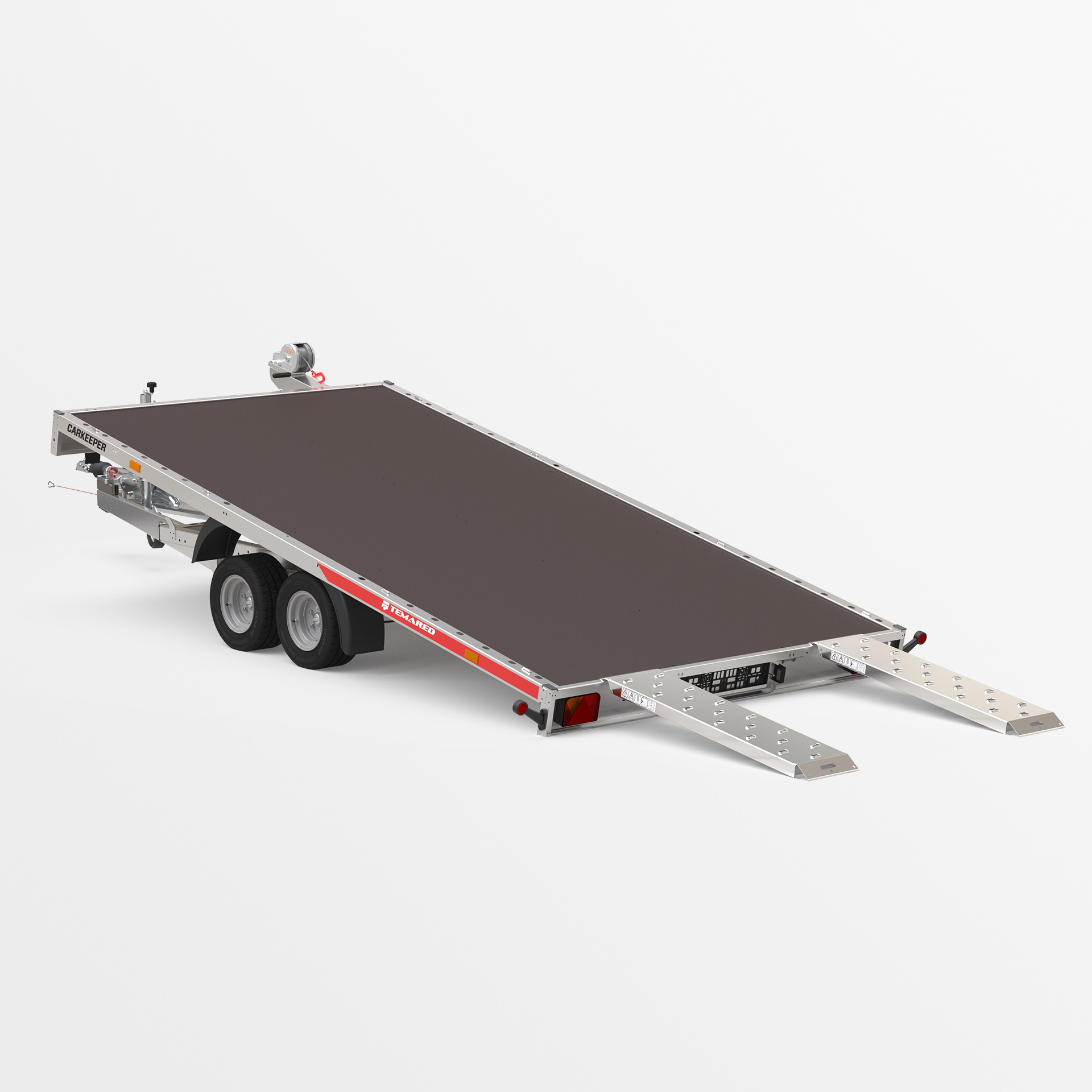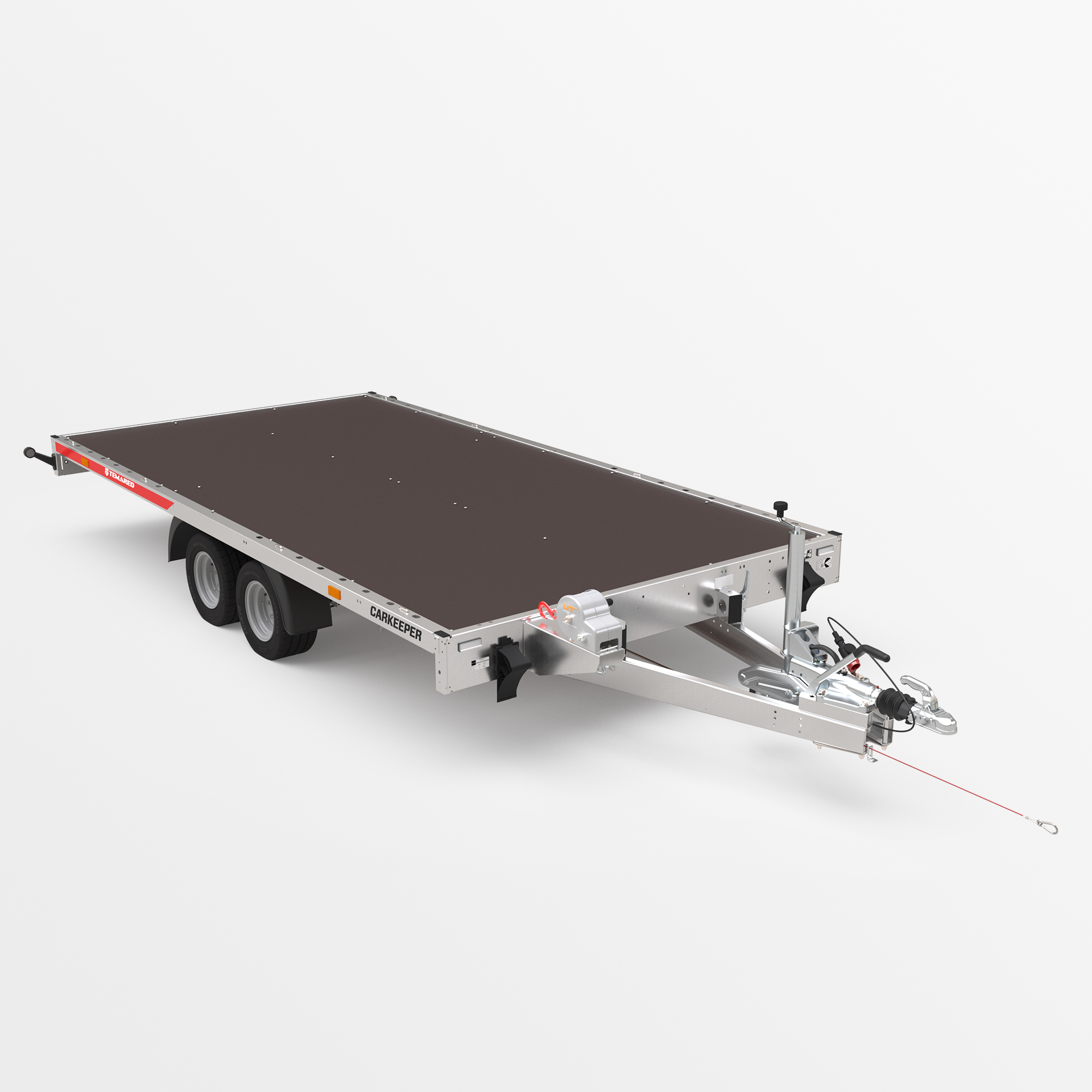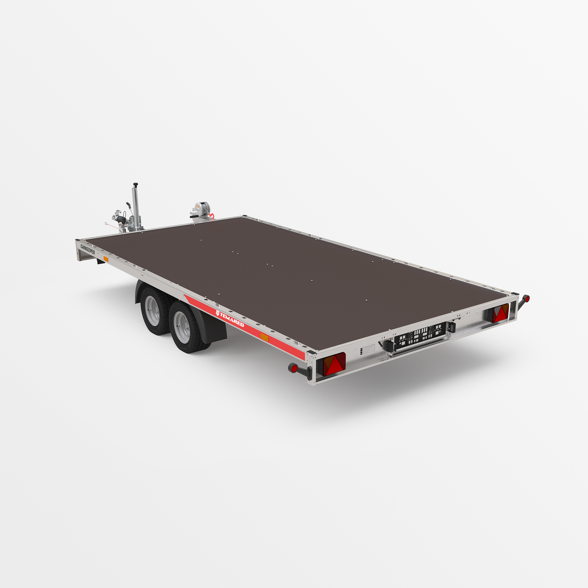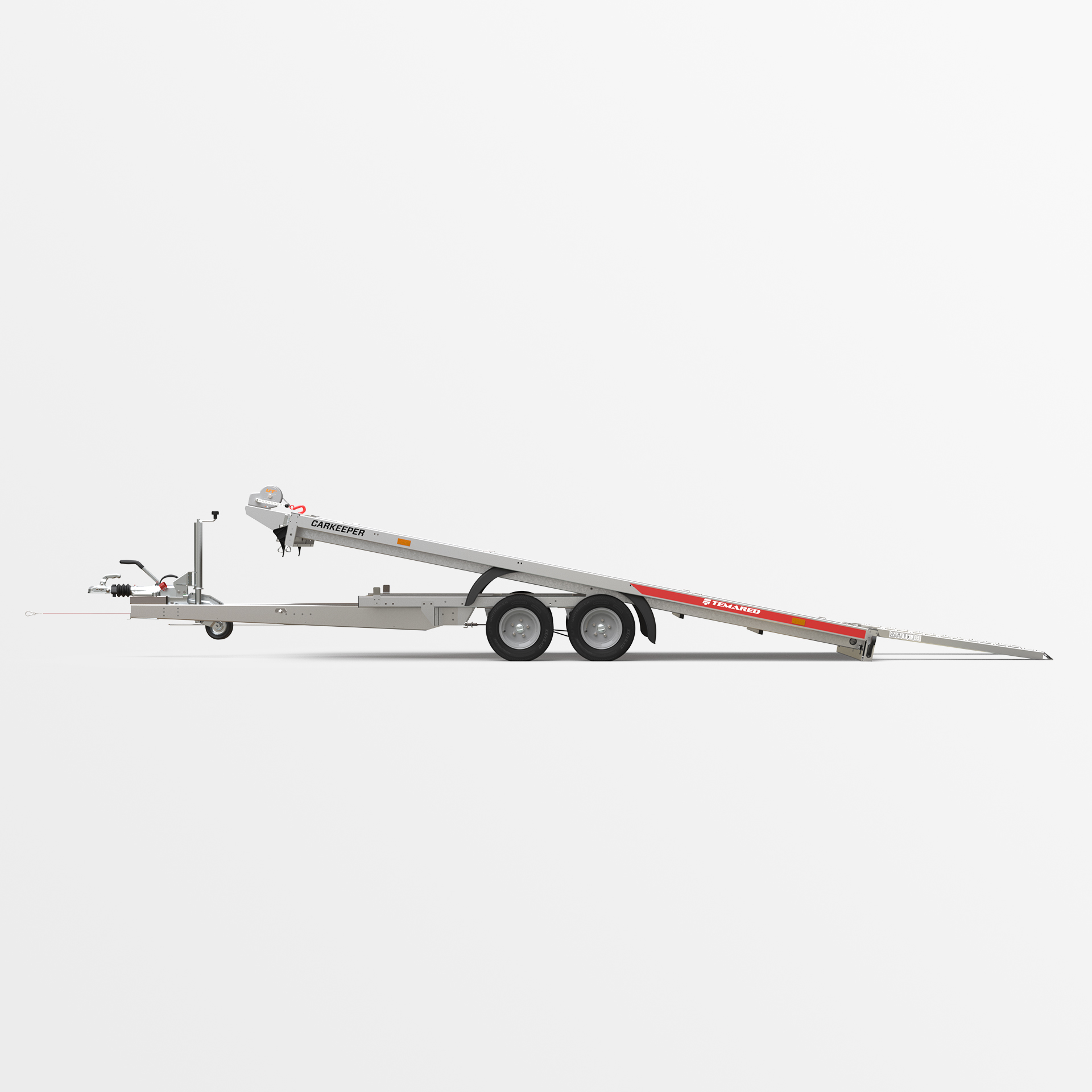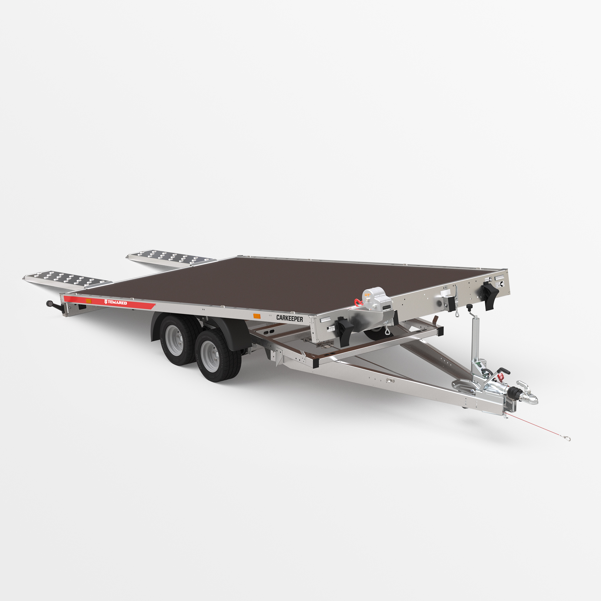 Remorque porte-voitures avec une plateforme de chargement basculante. Un faible angle de rampe (6°) permet de charger facilement des véhicules a faible garde au sol. Les rampes sont dissimulées sous la surface de transport. La plateforme a été élargie de 109 mm pour une meilleure compatibilité avec différents types de véhicules. Les variantes de plancher disponibles sont en tôle d'acier ou en aluminium – sans contreplaqué. Un perçage oblong plus dense permet l'utilisation de plus de points d'arrimage. Des ridelles en aluminium et une structure avec bâche sont disponibles en option.