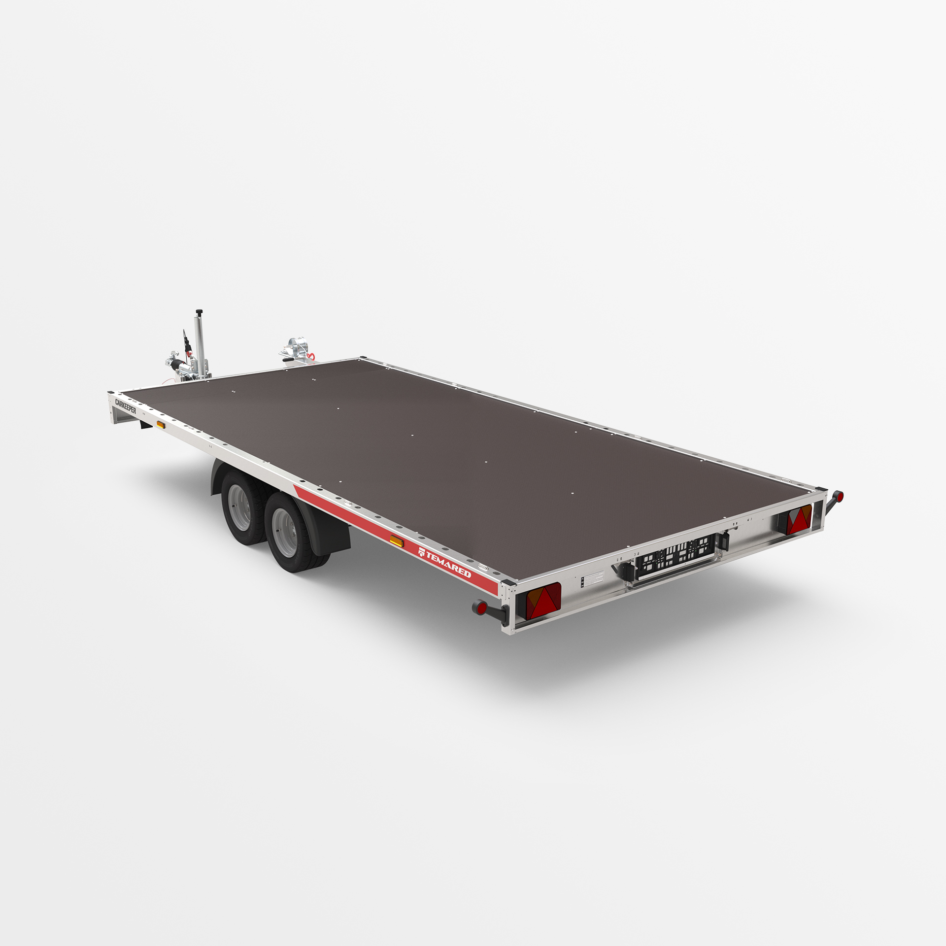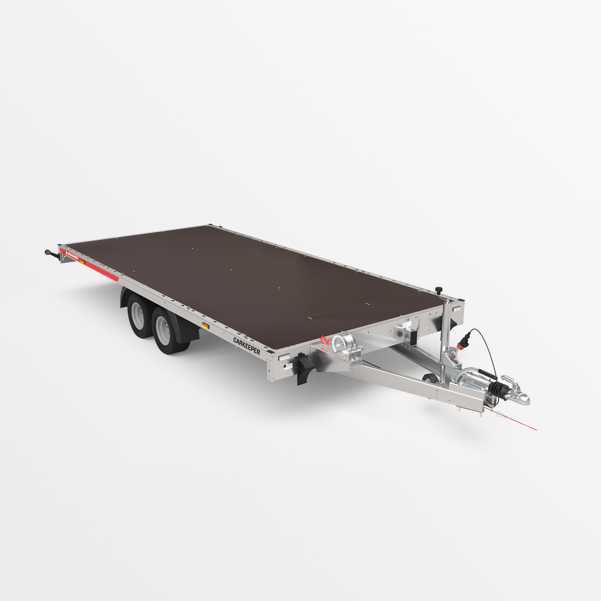 Remorque porte-voitures avec une plateforme de chargement basculante. Un faible angle de rampe (6°) permet de charger facilement des véhicules a faible garde au sol. Les rampes sont dissimulées sous la surface de transport. La plateforme a été élargie de 109 mm pour une meilleure compatibilité avec différents types de véhicules. Les variantes de plancher disponibles sont en tôle d'acier ou en aluminium – sans contreplaqué. Un perçage oblong plus dense permet l'utilisation de plus de points d'arrimage. Des ridelles en aluminium et une structure avec bâche sont disponibles en option.