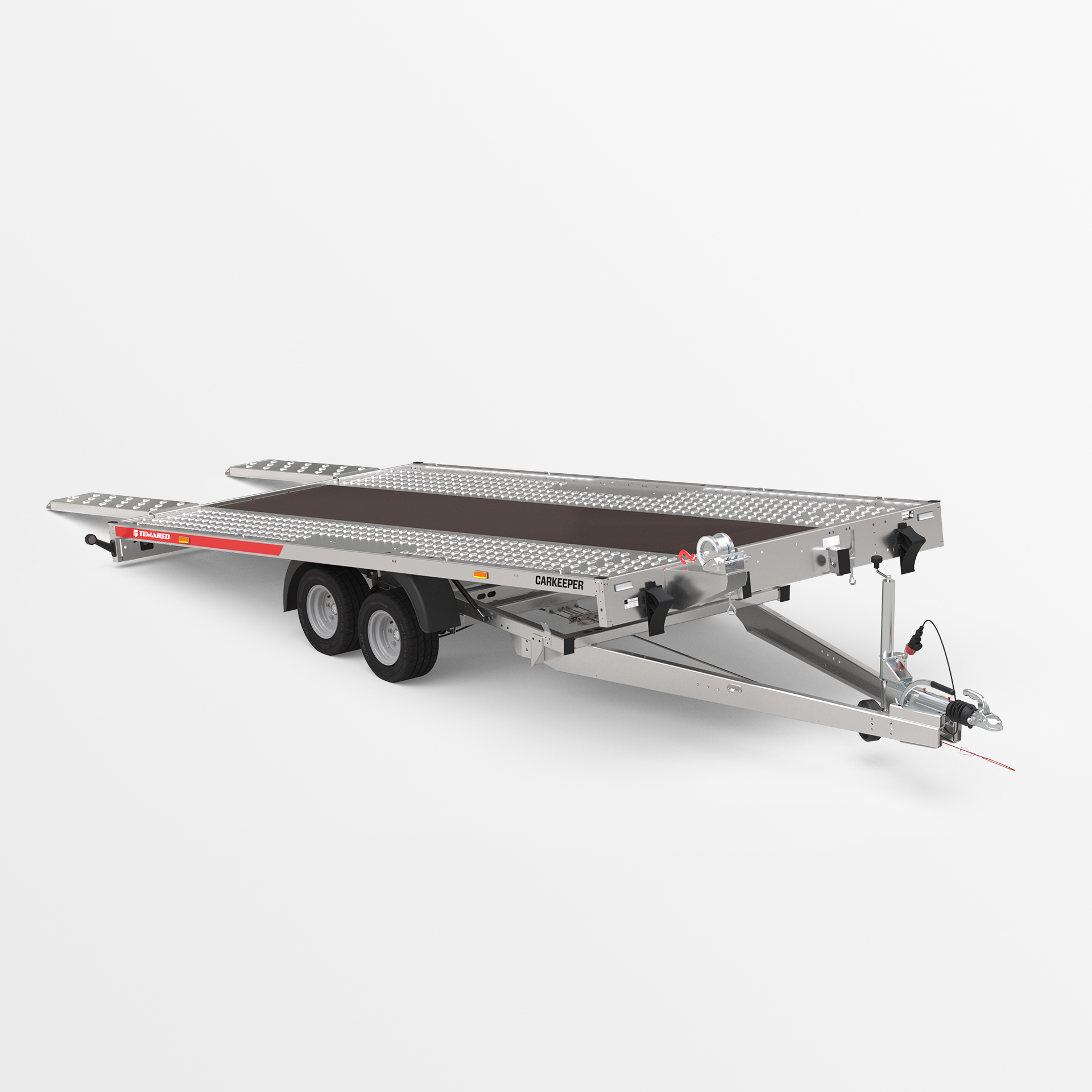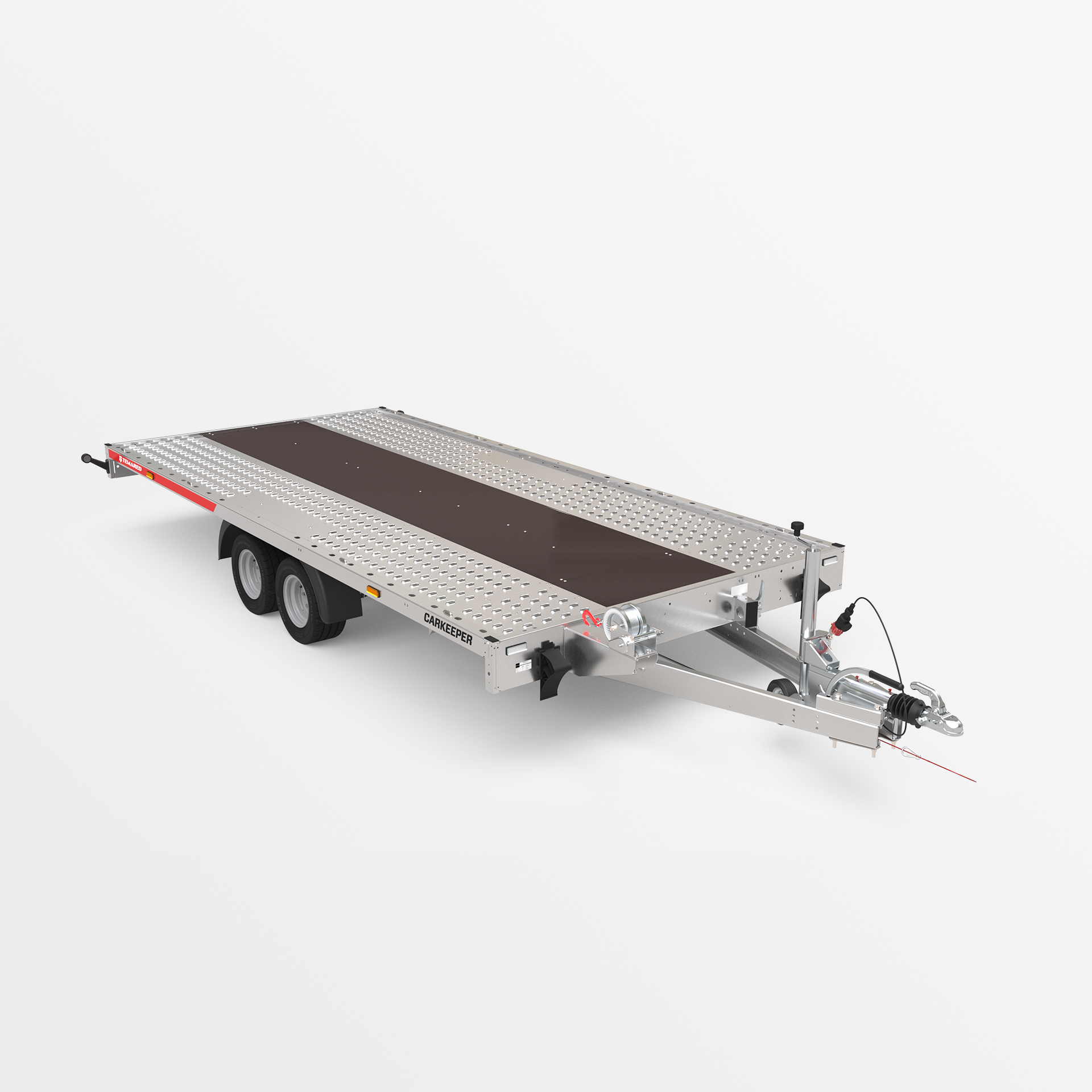 Remorque porte-voitures avec une plateforme de chargement basculante. Un faible angle de rampe (6°) permet de charger facilement des véhicules a faible garde au sol. Les rampes sont dissimulées sous la surface de transport. La plateforme a été élargie de 109 mm pour une meilleure compatibilité avec différents types de véhicules. Les variantes de plancher disponibles sont en tôle d'acier ou en aluminium – sans contreplaqué. Un perçage oblong plus dense permet l'utilisation de plus de points d'arrimage. Des ridelles en aluminium et une structure avec bâche sont disponibles en option.