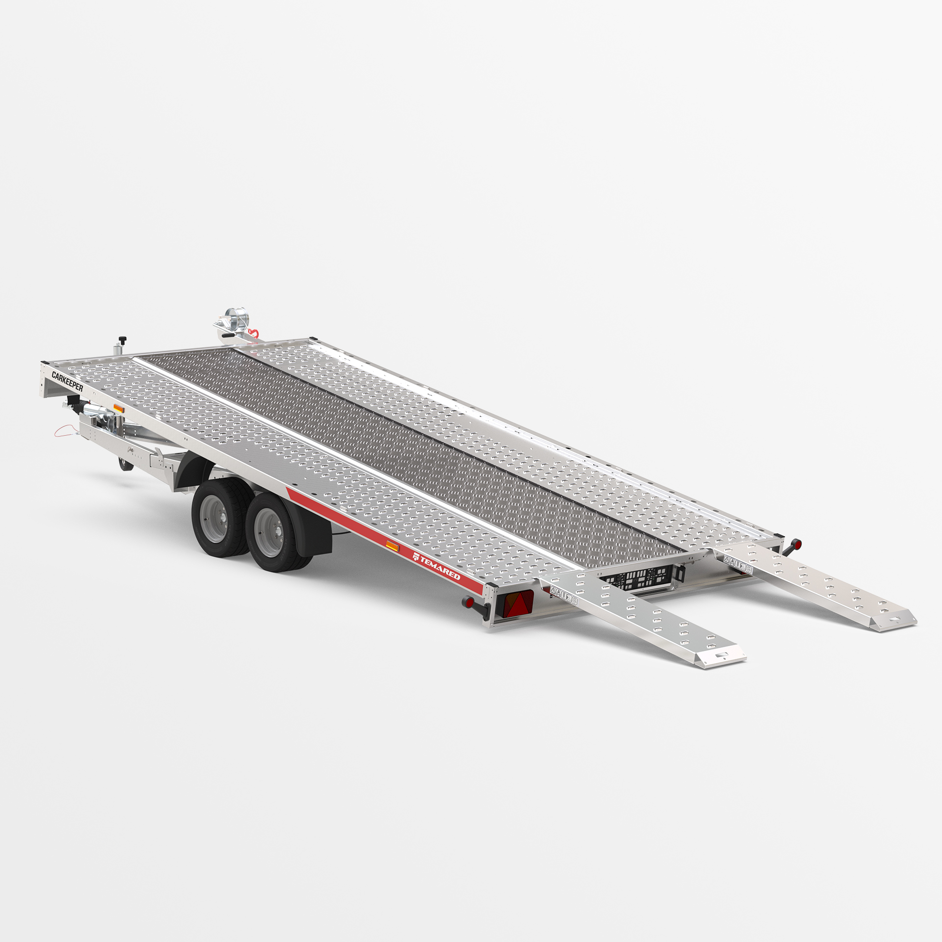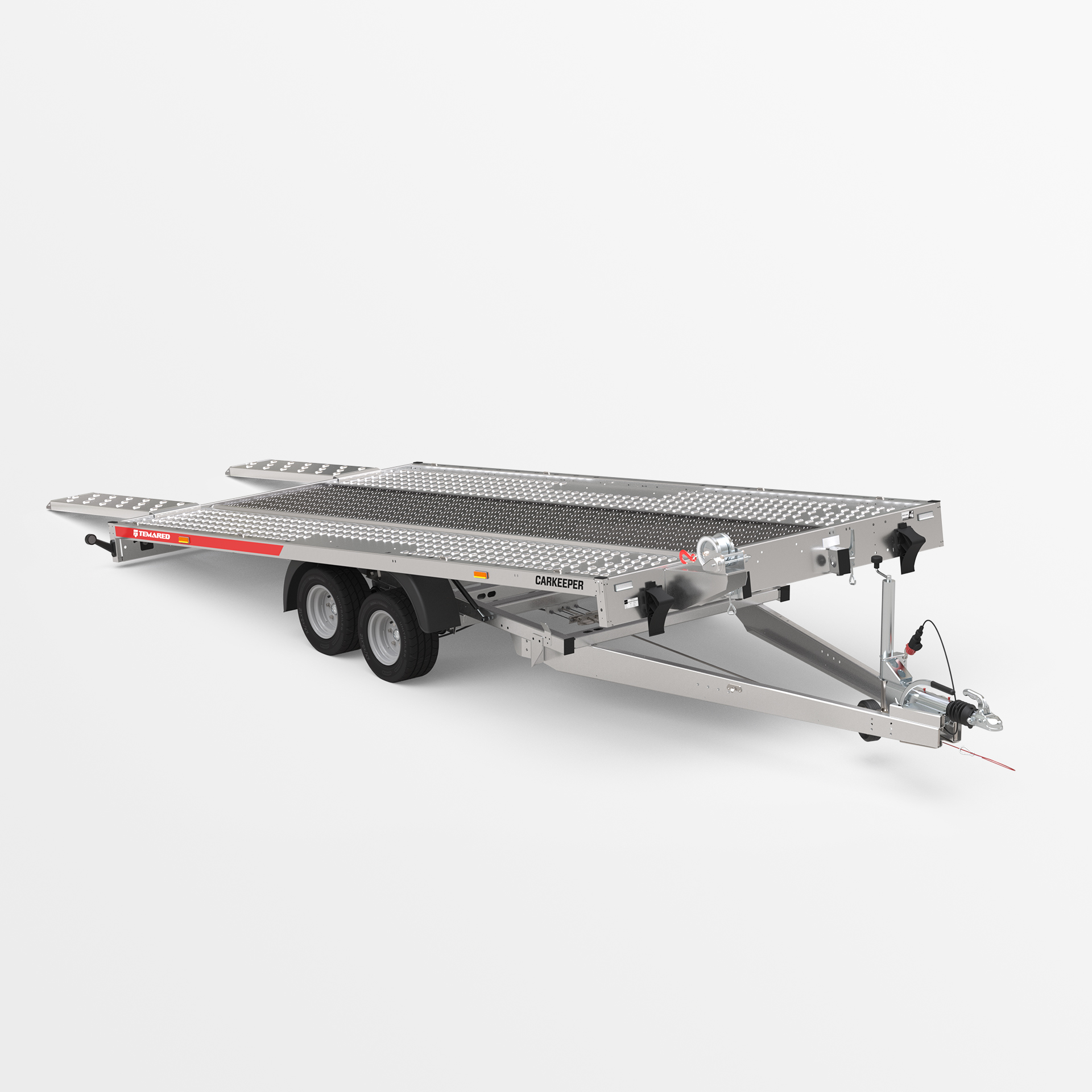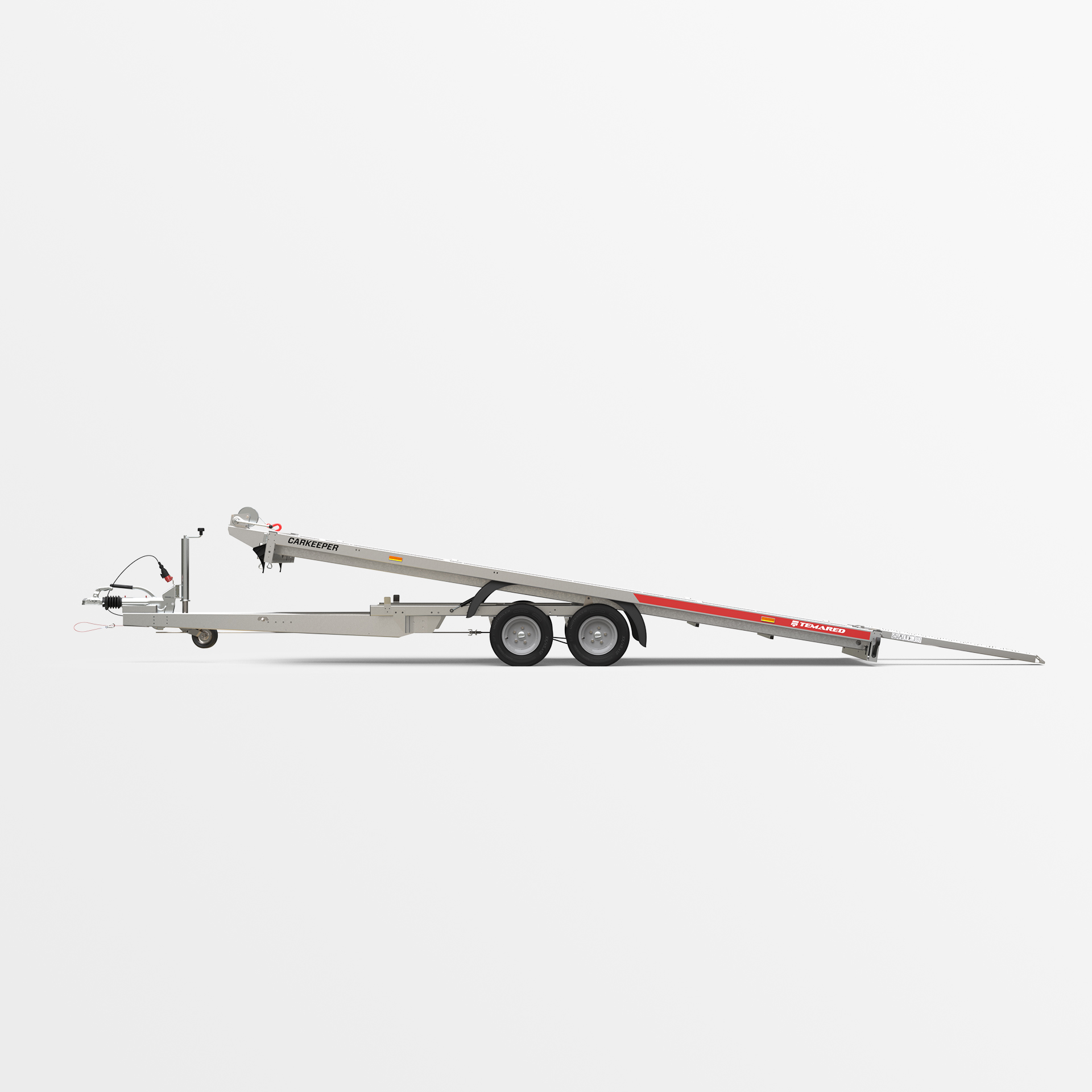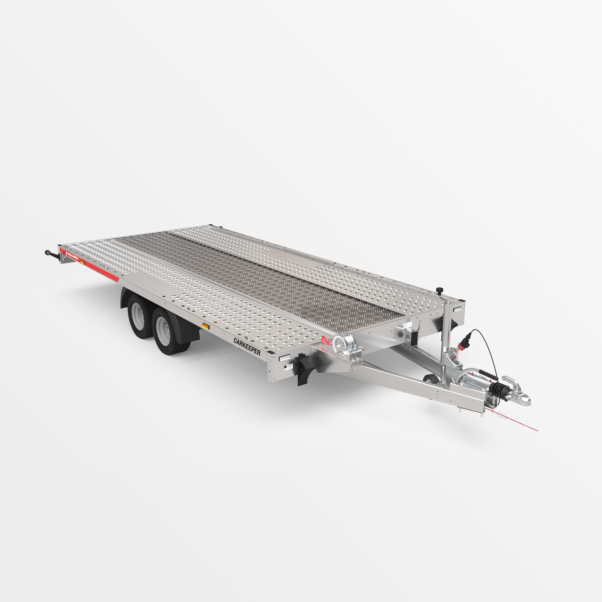 Remorque porte-voitures avec une plateforme de chargement basculante. Un faible angle de rampe (6°) permet de charger facilement des véhicules a faible garde au sol. Les rampes sont dissimulées sous la surface de transport. La plateforme a été élargie de 109 mm pour une meilleure compatibilité avec différents types de véhicules. Les variantes de plancher disponibles sont en tôle d'acier ou en aluminium – sans contreplaqué. Un perçage oblong plus dense permet l'utilisation de plus de points d'arrimage. Des ridelles en aluminium et une structure avec bâche sont disponibles en option.