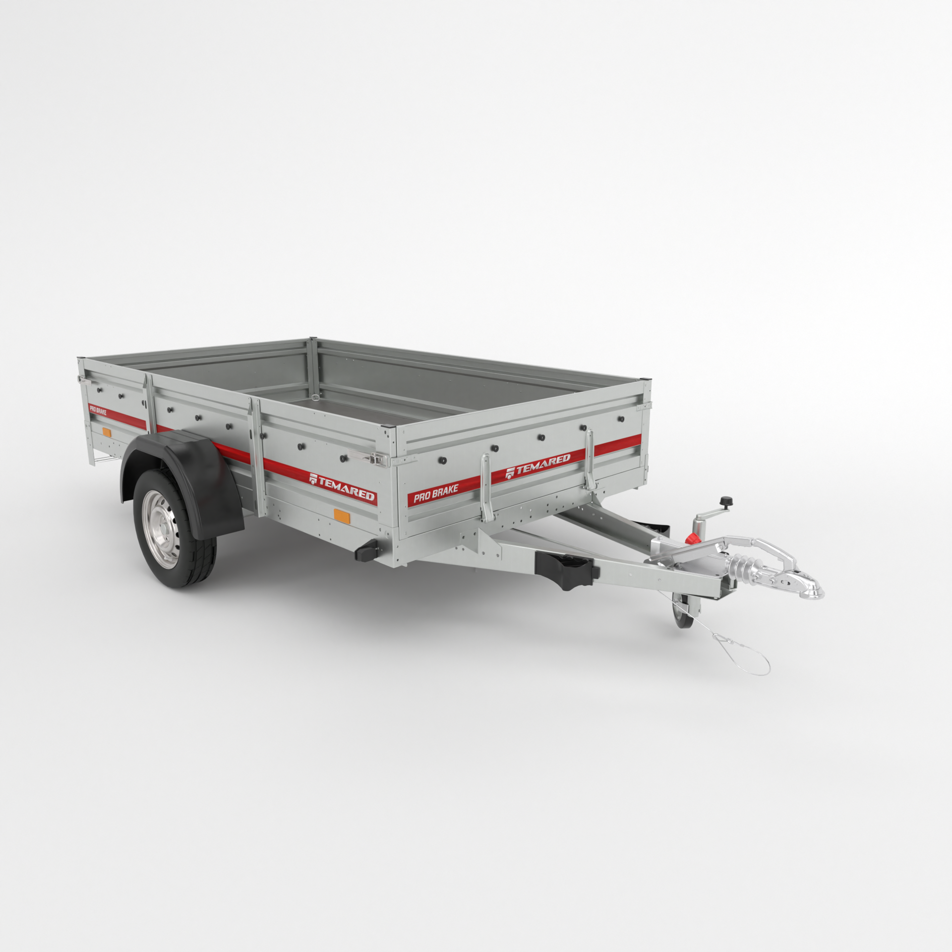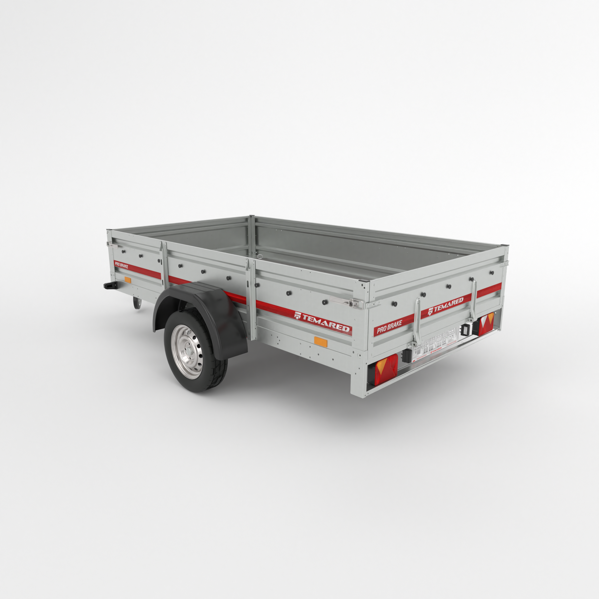 Remorque pour charges lourdes avec frein a inertie équipée d'un fixe d'attelage renforcé. Côtés en acier galvanisé de 400 mm de hauteur avec côtés avant et arriere ouvrables. Sous-châssis renforcé composé de sections pliées en acier galvanisé boulonnées ensemble. Sol en contreplaqué imperméable et antidérapant équipé de poignées pour attacher les ceintures. Roues a l'extérieur de la surface de transport avec un centre de gravité abaissé, ce qui la distingue des autres remorques freinées.