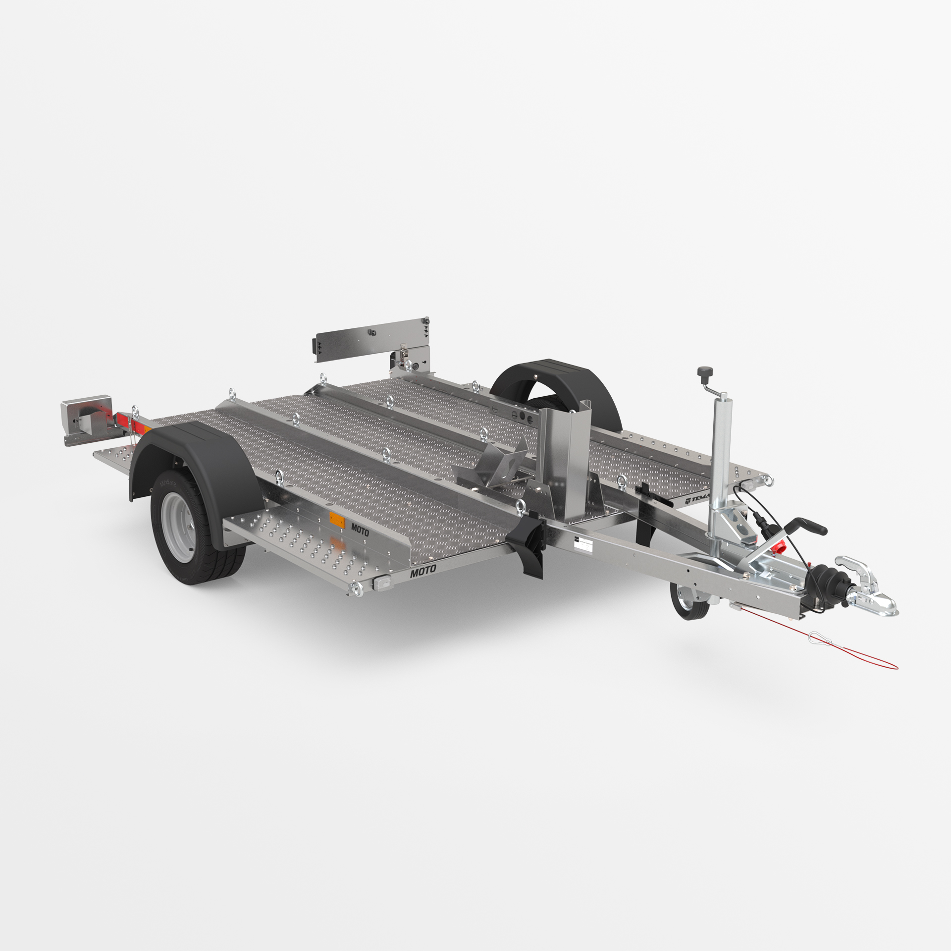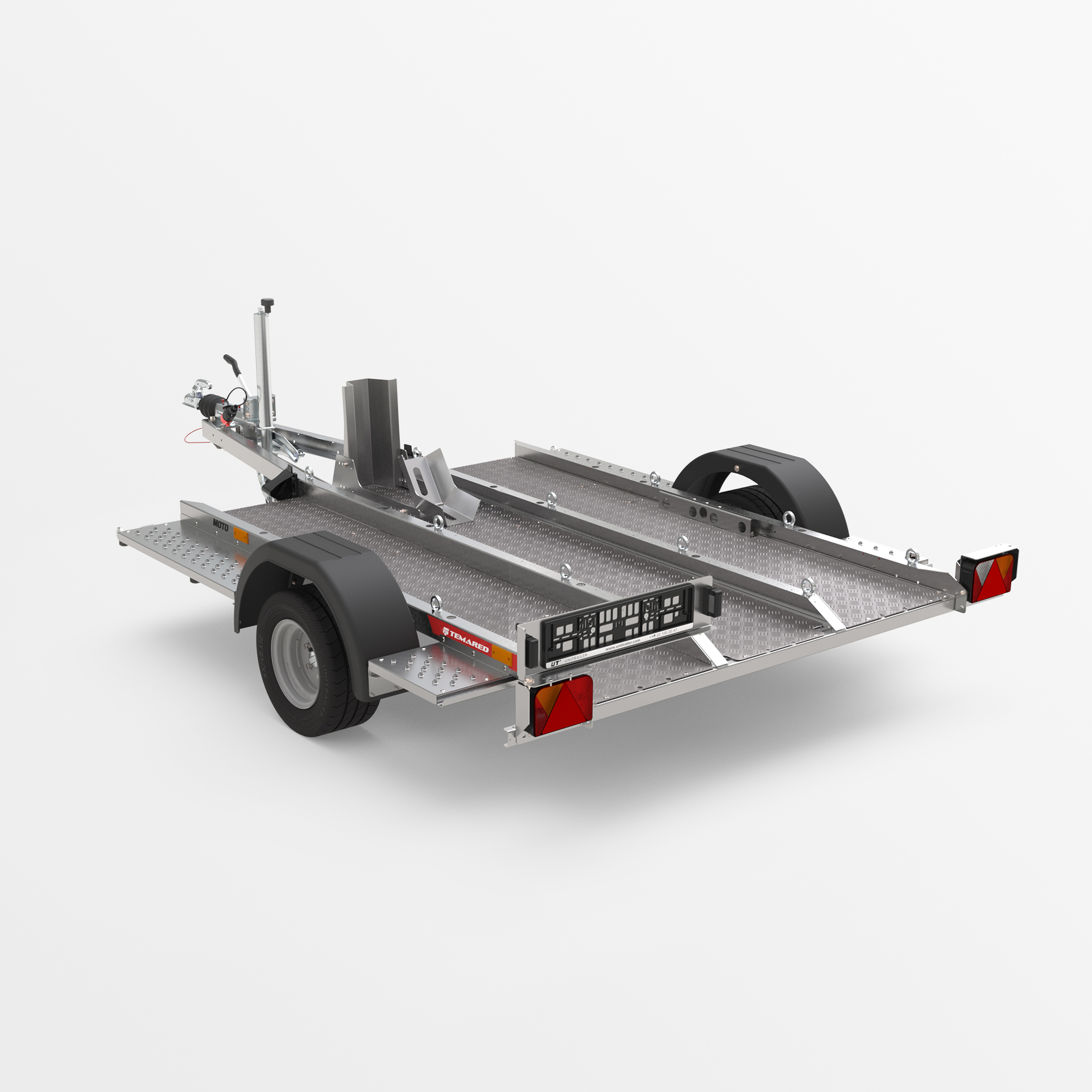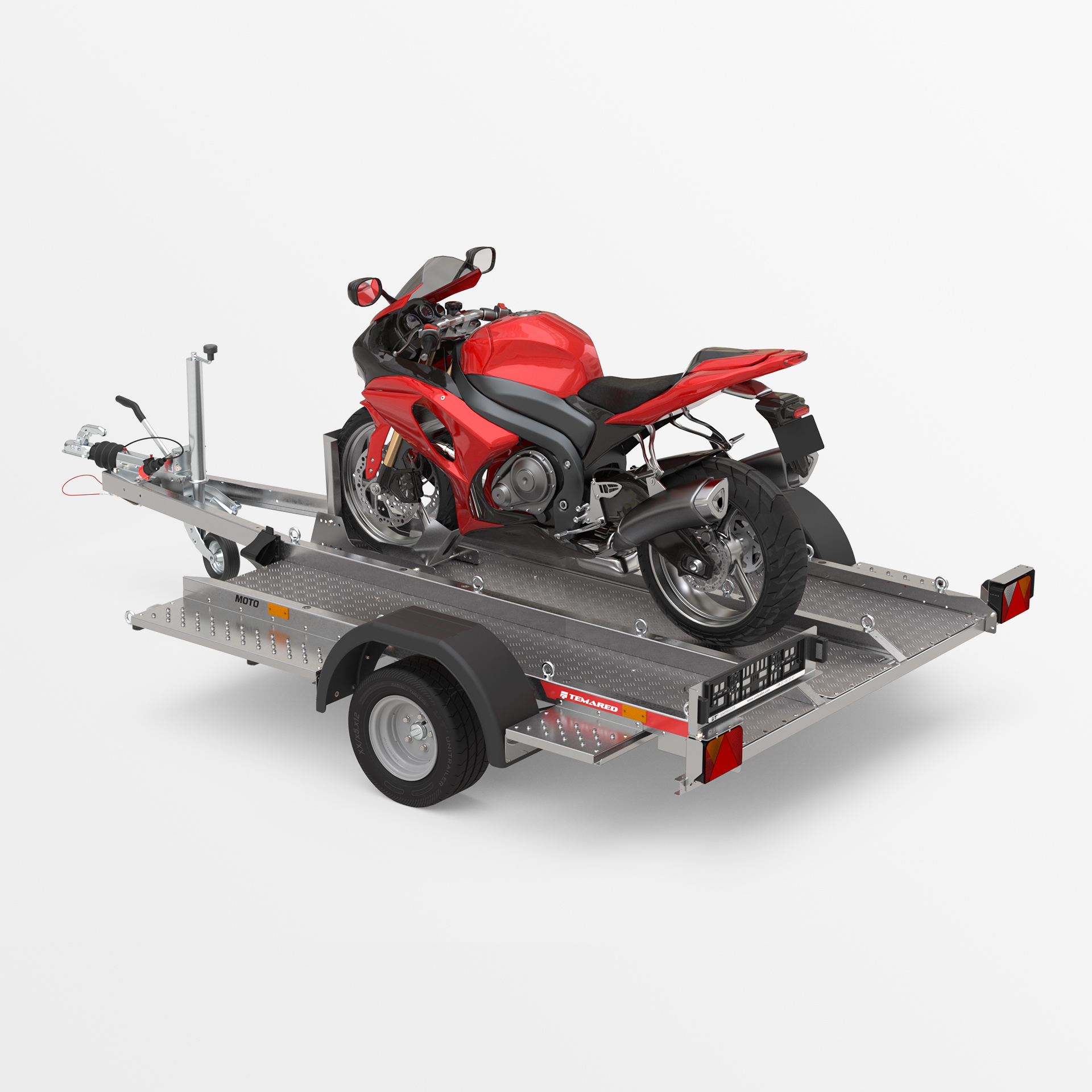 Przyczepa o spawanej konstrukcji, dedykowana do transportu motocykli i innych jednośladów. Platforma załadunkowa wykonana z ryflowanej blachy aluminiowej została wyposażona w liczne punkty mocowania pasów transportowych, zapewniające stabilne zabezpieczenie pojazdu. Obniżona konstrukcja z niskim progiem załadunku umożliwia łatwy i bezpieczny wjazd motocyklem.