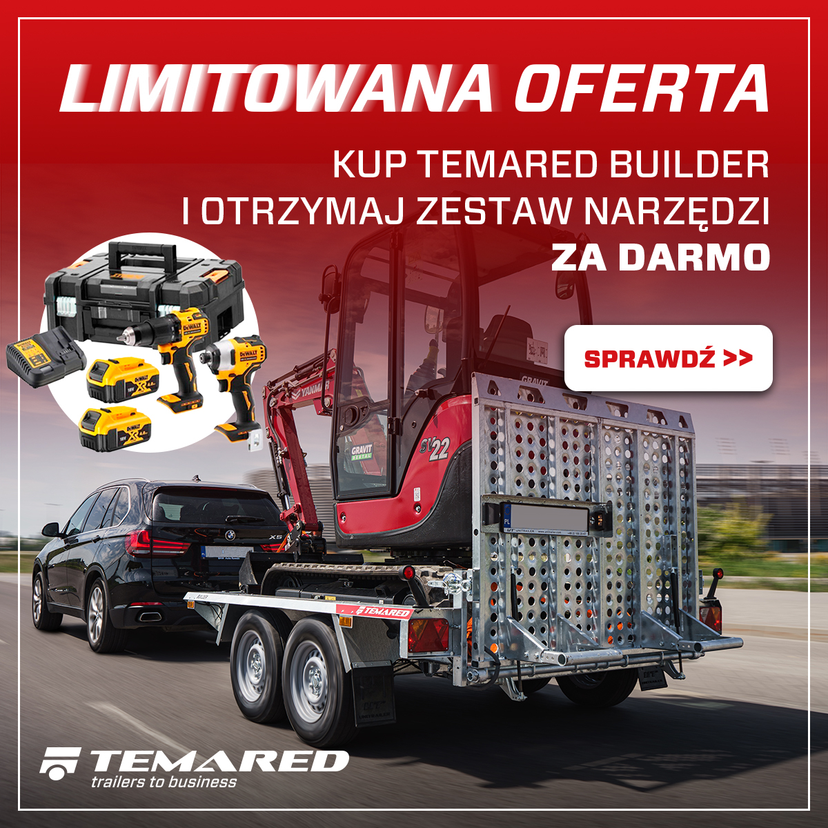 1. Kup nową przyczepę TEMARED BUILDER w trakcie trwania promocji tj. od 01.02.2026 do 31.03.2026.